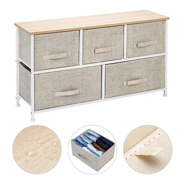 Introductions: Give your household essentials a cozy landing spot with the 5-Drawer Dresser. This beautiful dresser chest features a tabletop surface and pull-out drawers to tuck away household clutter. The thoughtful design is great for small living spaces and works equally well near the bed or sofa. Organization enthusiasts will enjoy filling each drawer with clothing, linens, and knick-knicks from around the home. The lightweight frame makes this unit easy to transport and when not in use, simply fold the fabric drawers flat for storage. Use alone as a single unit or pair with any drawer configuration from the Furniture Collection. Features: 1.Restore A Tidy Home: Bits and pieces scattered everywhere in your home? With these 5 removable drawers you can sort items by type; easily tame the mess and bring back the fresh feeling to your sweet home 2.When Fabric Meets Rigid Metal: A perfect mix bringing its strengths into full play - iron frame offers stable support for fabric boxes, and the fabric element adds a soft and warm touch to the metal-framed dresser drawer, and is more lightweight to move 3.Every Room Scrambles For It: The cloakroom wants it as a cabinet to offer a home for workout gear, leggings and pajamas; the nursery wants a chest of drawers to stow baby stuff; the entryway wants a space saving storage unit for coming and going things; what's your plan 4.Stability Comes First: Crafted with a wooden tabletop and metal frame, the dresser is stable and durable. 4 adjustable feet allow you to use it on uneven surfaces and adds extra stability 5.Easy to assemble: With a simple structure, it's a breeze to assemble the storage unit. Simply fix the screws in position and unfold the 5 drawers and it's ready to tame the mess Note: 1.When receiving the goods, please confirm the product according to the listing of instructions. Once you find Less pieces, please provide relevant pictures to contact us. We will deal it in the time. 2.Please install goods with the instruction manual. 3.It is recommended that the installation should not be too tight to adjust easily. After the structure is installed, firm the interface for more stability. Specifications: 1.Color: Linen / Natural£¬brown£¬gray 2.Material: MDF(Medium Density Fiberboard),Iron,Non-Woven Fabric 3.Frame Dimension: (39.4 x 11.4 x 21.7)" / (100 x 30 x 55)cm (L x W x H) 4.Drawer Dimension: (18.11x 10.63 x 8.46)"/ (46 x 27 x 21.5)cm (L x W x H) / (11.81 x 10.63 x 8.46)" / (30 x 27 x 21.5)cm (L x W x H) 5.Drawers: 5drawers 6.Product Care: Wipe Clean With A Wet Cloth And Let It Dry 7.Product Weight: 20.5lb / 9.3kg 8.Static Load Capacity Of The Shelf: 33lb / 15kg 9.Static Load Capacity Of Each Drawer: 11lb / 5kg Package Includes: 1 x Drawer Storage Dresser 1 x Assembling Tool Kit 1 x Instructions