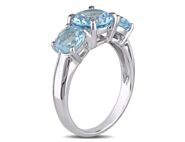 This beautiful ring features three round-cut sky blue topaz stones set in sleek sterling silver. A 2.35 carat (ctw) brilliant round center stone is supported on 2 sides by 6x6mm, 2.00 carats (ctw) of round blue topaz gems making this stylish and affordable three stone ring featuring the birthstone of December. This charming ring is enhanced with a high polish finish.