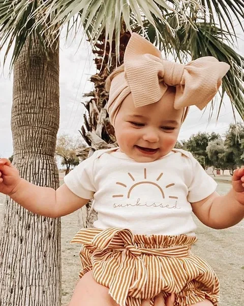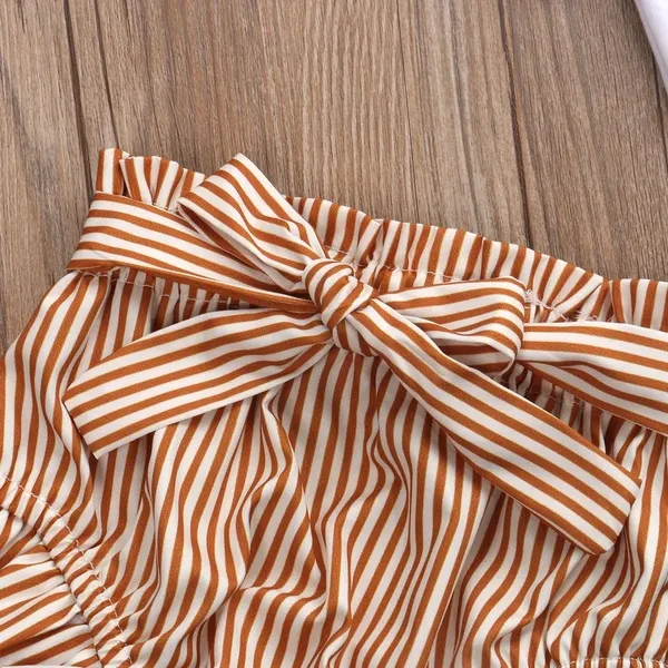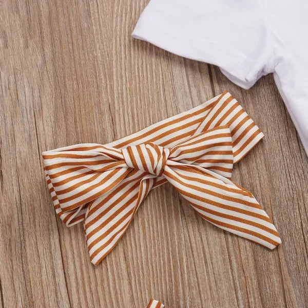 Specifications Material: Cotton + Polyester Gender: Girls Season: Summer, Autumn Suitable Age: 0-2 Years Old Pattern Design: Printing, Striped Style: Fashion, Cute Size Chart:(cm/inch) Size Romper Bust Shorts Age 70 36/14.17 49/19.29 18.5/7.28 0-6 Months 80 38/14.96 51/20.08 19/7.48 6-12 Months 90 40/15.75 53/20.87 19.5/7.68 12-18 Months 100 42/16.54 55/21.65 20/7.87 18-24 Months Note: 1. All dimensions are measured by hand, there may be 2-3 cm deviations; 2. Due to the difference between different monitors, the picture may not reflect the actual color of the item. Thank you for understanding! Package Contents 1 x Baby Girls Romper 1 x Shorts 1 x Bow Headwear8520/