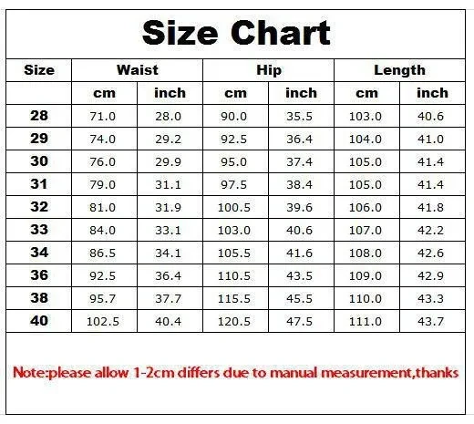 Packing: 1 * pants Color: black, blue Fabric: Polyester Size: 28, 29, 30, 31, 32, 33, 34, 36, 38, 40 Features: trousers, slim fit, jeans, straight-leg pants, classic, blue, black, work Please note: 100% brand new and high quality Stylish and unique design, very popular Color may vary due to different display settings The measurement is done manually, please wait a moment Thank you for your understanding