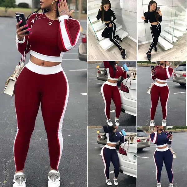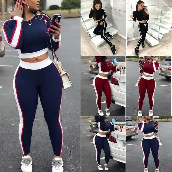 Women Autumn Casual Tracksuit Top Pants Slim Striped Patchwork Pants Sexy Sweatshirt 2Pcs Set