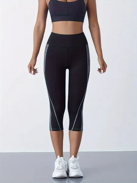 Women's Capri Yoga Pants, High Waist, Stretchy Sports Leggings, Athletic Tummy Control Workout Fitness Cropped Tights With Contrast Mesh Panels