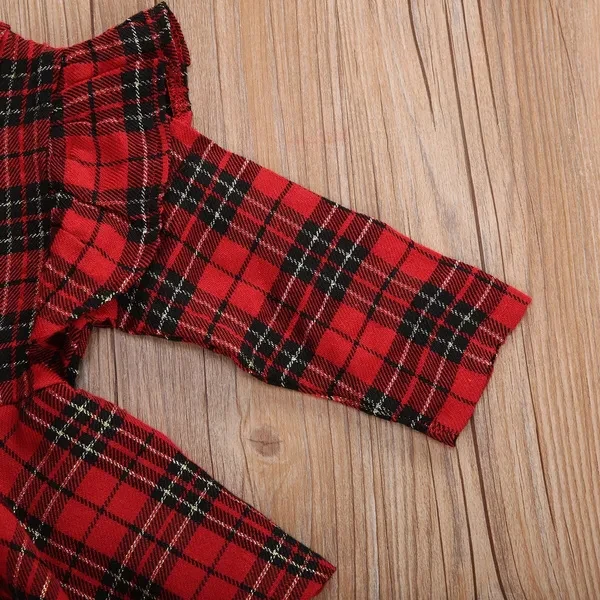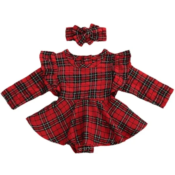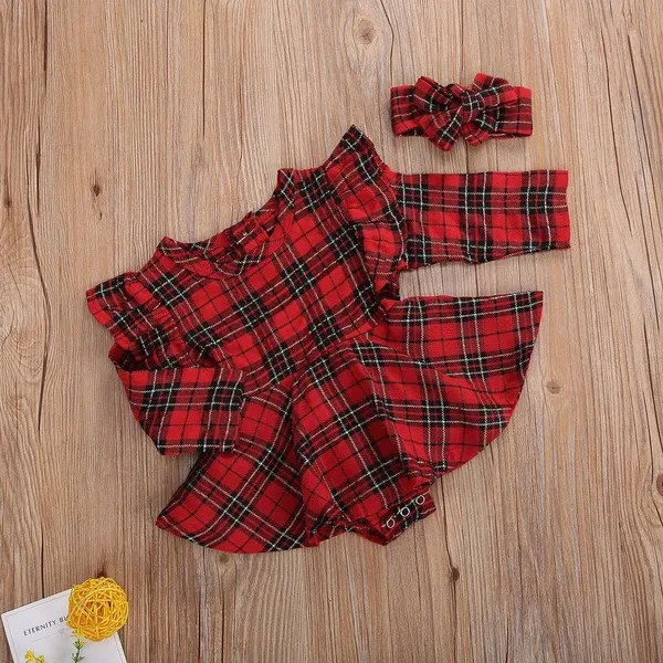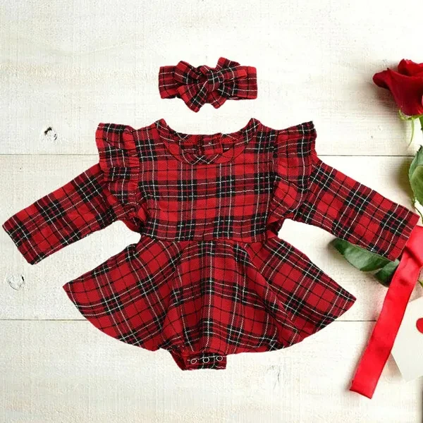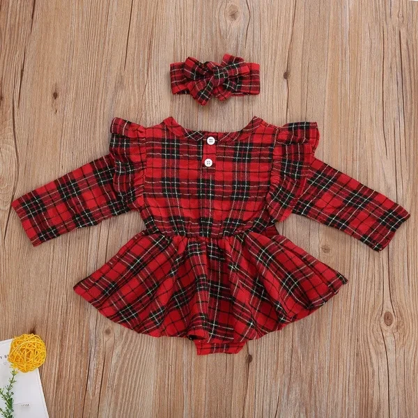 0-24M Infant Baby Girl Romper Headband 2pcs Ruffle Long Sleeve Plaid Jumpsuit Skirt Clothes Set