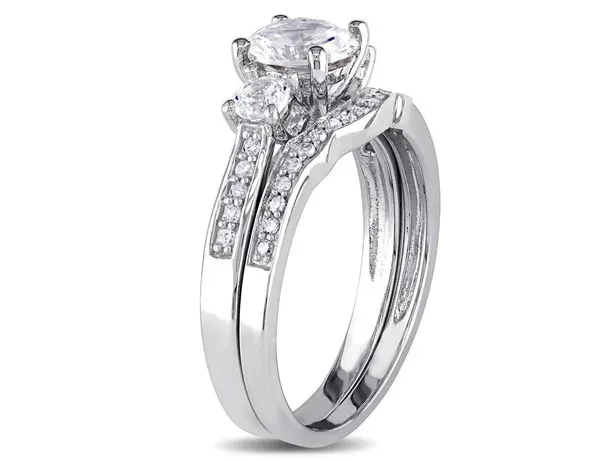 1 1/3 Carat (ctw) Lab-Created White Sapphire with Diamond Bridal Wedding Set Engagement Ring in 10K White Gold This stylish engagement ring features three brilliant round-cut created white-sapphires and white diamond side stones. This elegant set is complemented by a stunning diamond-studded wedding band. Both rings are crafted of lustrous 10-karat white gold and are enhanced with a high polish finish. This engagement ring and matching wedding band is the perfect gift that she will love. Beautifully crafted in 10k white gold with a Polished Finish Stone Type: Sapphire; Color: White; 0.3 CTW; Quantity: 2; Brilliant Cut; Round Shape; Dimensions: 3x3 mm; Lab Created; 4-Prong Setting Stone Type: Sapphire; Color: White; 1.01 CTW; Quantity: 1; Brilliant Cut; Round Shape; Dimensions: 6x6 mm; Lab Created; 4-Prong Setting Sapphire Gemstone is the Birthstone for the Month of September This Diamond Engagement Ring is the perfect gift for any bridal engagement, birthday, anniversary, holidays, thank you, thinking of you, or for any reason at all SKU: 08DLG1001935CWSA-P