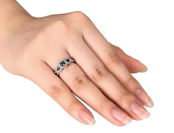 This glamorous ring features three shining blue diamonds to represent your past, present and future together. The 14 karat white gold band is adorned with round brilliant diamonds for even more sparkle, bringing the total gem weight to over 0.50 carats (ctw).