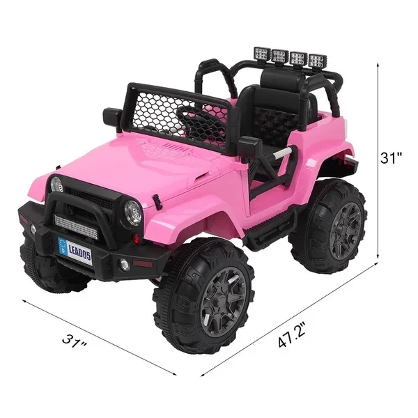 Features: 1. Easy to assemble 2. 2.4g remote control. 3 different speed modes 3. Led headlights, a horn, and easy start / stop button 4. Able to connect your portable devices to play music or stories 5. Equipped with mp3 player, radio, usb port, tf card slot. Available to support mp3 format 6. 4*wheels with spring suspension to ensure a super smooth ride 7. Automatic reset fuse for protection circuit 8. Rechargeable 12v battery. Comes with a charger to allow for hours of playtime 9. Parents can let their child drive manually or use the remote control to safely guide them when necessary 10. Includes a remote with 3 speed modes, parking mode, and forward / reverse functionality. Easy to control the car and ensure the child's safety 11. Adjustable seat belt for safe and comfortable use 12. Recommended for children 3 to 8 years old Specifications: 1. Color:Pink/ Green/Blue/White/Black/Red 2. Seat Width - 15.8", Seat Depth - 8.7" 3. RC Mode: 3 Speeds Options 4. Maximum User Weight: 66lb / 30kg 5. Speed: 3-6 KM/H (3.7mph max) 6. Charge Time: 8-12 Hrs. 7. Run Time: 1-2 Hrs. 8. Wheels: 14"(Dia) Each 9. Battery Type: 12V 7AH 10. Controller Battery: 2 x AAA Batteries (not Included) 11. Overall Dimensions: (47.2 x 31 x 31)" / (119.89 x 78.74 x 78.74)cm (L x W x H) Package Includes: 1 x Electric Car 1 x 2.4G Remote Control 1 x Charger 1 x Manual