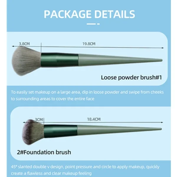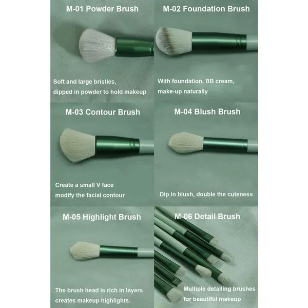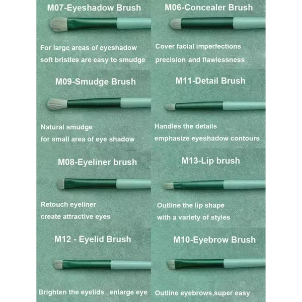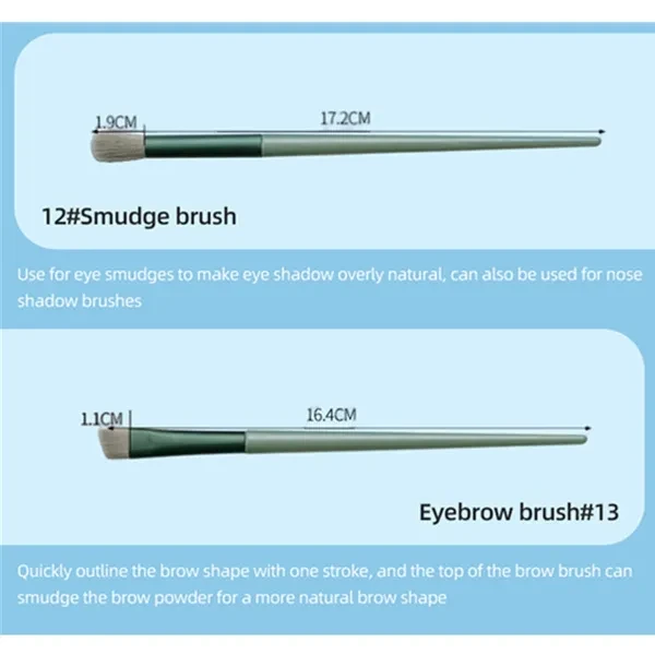 Set of 13 brushes, including foundation brush, makeup brush, shadow brush, blush brush, eye shadow brush, lip brush, etc. Soft and fine artificial fibers reduce damage to the skin. Item: Makeup Brush Color: green, light coffee. Package Include: 13Pcs Makeup Brush (with storage bag) Warm Remind: 1. About size: It will be 1-2cm differences due to manual measurement factors. (1cm=0.39inch, 1 inch=2.54cm) 2. About color: Due to the difference of monitors and light effects, the actual color of items might has slightly different from the color be shown in the pictures. Thanks for your understanding.