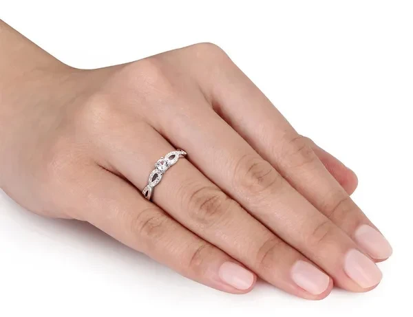 1/4 Carat (ctw) Lab-Created White Sapphire Infinity Ring with Diamonds in Sterling Silver Make your romantic attentions known with this shimmering created sapphire and diamond promise ring. Featuring a brilliant white round-cut created sapphire nestled between two swirling infinity loops, this wedding ring signifies your lasting commitment to love. Sparkling round-cut diamonds complete this piece, bringing added sparkle and shimmer to the band. Beautifully crafted in 0.925 sterling silver with a Polished Finish Stone Type: Sapphire; Color: White; 0.23 CTW; Quantity: 1; Brilliant Cut; Round Shape; Lab Created; Prong Setting Stone Type: Diamond; Color: G-H; Clarity: I2-I3; 0.08 CTW; Quantity: 20; Brilliant Cut; Round Shape; Dimensions: 3.5x3.5 mm; Natural; 4-Prong Setting Sapphire Gemstone is the Birthstone for the Month of September This Diamond Ring is the perfect gift for any birthday, anniversary, holidays, thank you, thinking of you, or for any reason at all SKU: 68DLG1000978CWS-P
