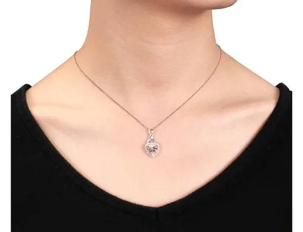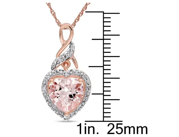 A shimmering jewel heart shines from the center of this beautiful gemstone necklace. Set in glistening 10-karat rose pink gold, this infinity heart drop pendant features 1.80 carats (ctw) of glowing pink Morganite and twinkling white diamonds. Matching earrings are available.