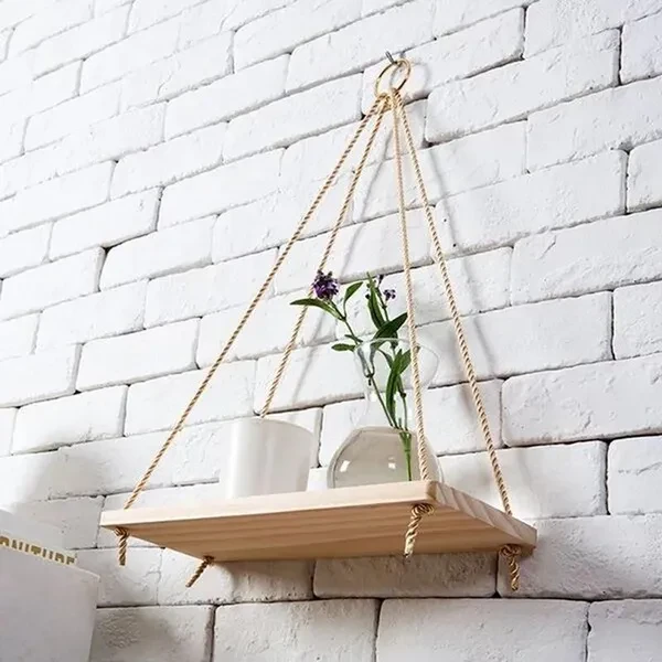 1PC Solid Wood Rope Hanging Wall Shelf Vintage Floating Storage Rack Home Decoration