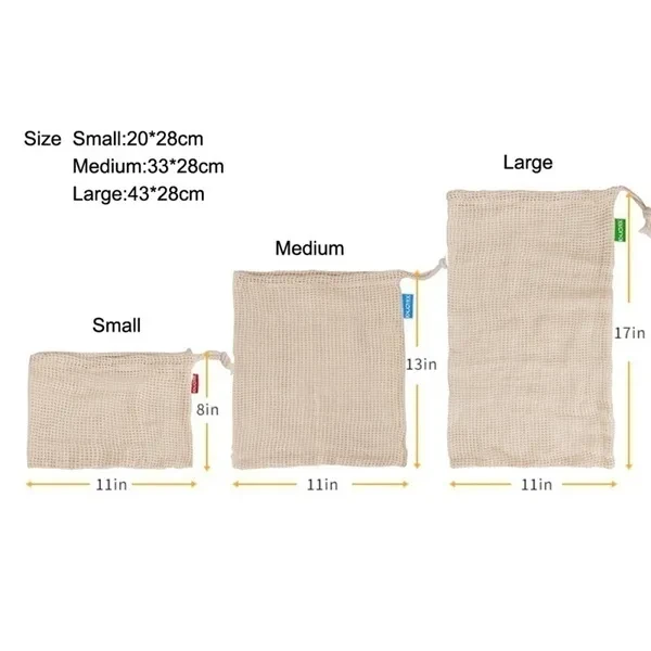 Product Size: Small 20*28cm/8*11in Medium 33*28cm/13*11in Large size 43*28cm/17*11in Material: cotton mesh + cotton rope Uses:storage, shopping Type :Vegetable Kitchen Storage Bag Theme :Home, Garden Package included: 1Pcs(S/M/L) Or 3Pcs(1Pcs-S +1Pcs-M +1Pcs-L) * Storage Bag