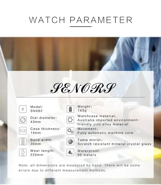 Description Model Number:SN082 Item Type: Mechanical Wrist Feature: Water Resistant、Calendar, energy indicator Water Resistance Depth: 3Bar Dial Diameter: 43mm Band Length: 21cm Case Thickness: 14mm Clasp Type: Buckle Band Width: 20mm Case Material: Stainless Steel Band Material Type: Leather Dial Window Material Type: Hardlex Crystal Movement: Automatic Self-Wind weight: 85G Feature: - Advanced manufacturing technology; - Cool & Specially designed big display screen; - Watch Crown With Environmental IPS Bronze Electroplating; - Stainless steel buckle & back case with SENORS logo; - Display system of 12 hours or 24 hours; - 30 Meters Water Resistant(Please Don't Press Any Keys Underwater); Package included: -1 * Watch -1 * Gift Box -1 * Manual Instruction Please give us a five-star feedback if you are satisfied with our products and service. Reminder: 1. Please peel all films off before wearing. 2. Please keep the watch away from magnet to avoid making the watch stop working. 3. Turn normal position crown clockwise 30~40 rounds to wind up fully. 4. Stop turning the crown once you feel the spring tight.Otherwise it will lead to the crown off. Items will be shipped via the registered number of registered numbers, depending on the destination and other factors (custom clearance or vacation period, etc.). Delivery time is continuous. A) United States, Canada, Australia: 7-25 business days. B, UK, France, Germany, Sweden, Austria, Belgium, Denmark, Ireland, Luxembourg, Jack, Greece, Hungary, Iceland, Italy, Portugal, Romania, Slovakia, Spain, Switzerland: 8-25 business days. C) Other countries: 15-60 working days. Please note that the delivery time may be longer, especially at peak or bad weather conditions. If you pay now, we will ship within 48 hours! Wish you happy!