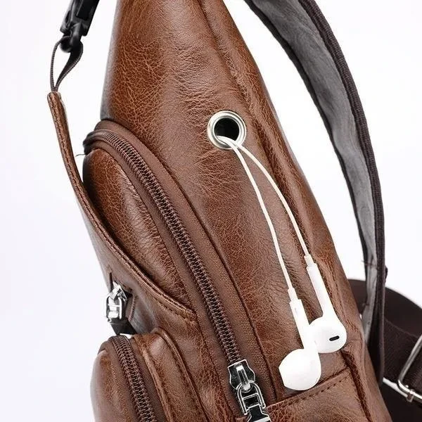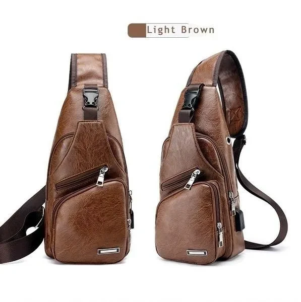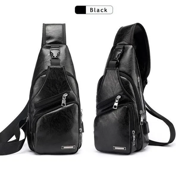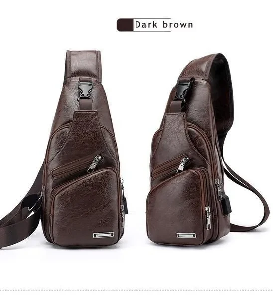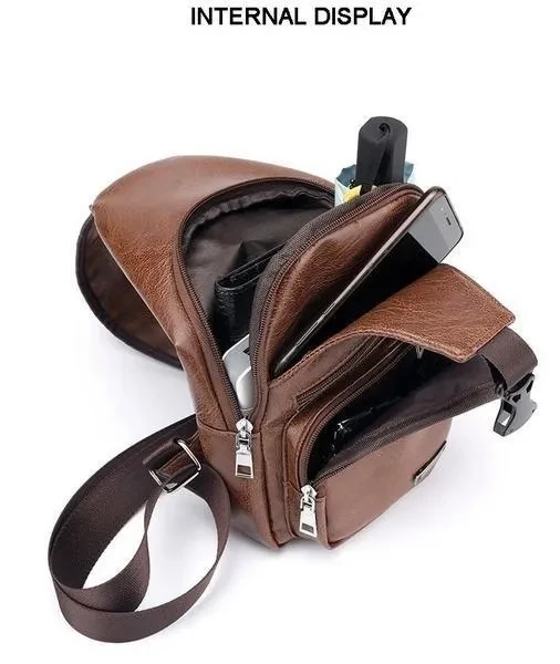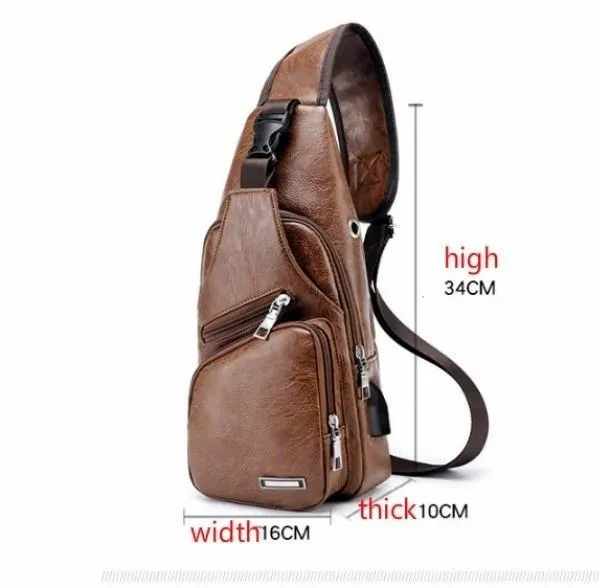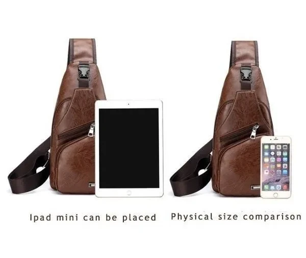Material: PU leather Size:chest bag(17x35x6cm) (Conversion: 1cm=0.3937 inch, 1inch=2.54 cm) Weight:chest bag:230g Packing include:1pc xbag It's perfect for walking/traveling/biking/hiking and everyday using The chest bag equipped with earphone hole and USB charging port which is very convenient. There is no power supply for the USB port Perfectly works as sling shoulder pack, wear this sling bag over either shoulder comfortably, or across the chest to deter thieves and keep your hands free There is spacious room for your daily essentials: umbrella, iPad mini only, cell phone, wallet, credit card, earphone and camer