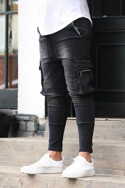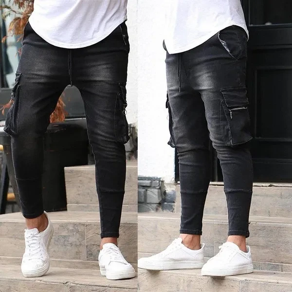 2024 New Men's Fashion Casual Pants Super Skinny Stretch Jeans Slim Fit Denim Leggings Fashion Men's Multi Pocket Trousers