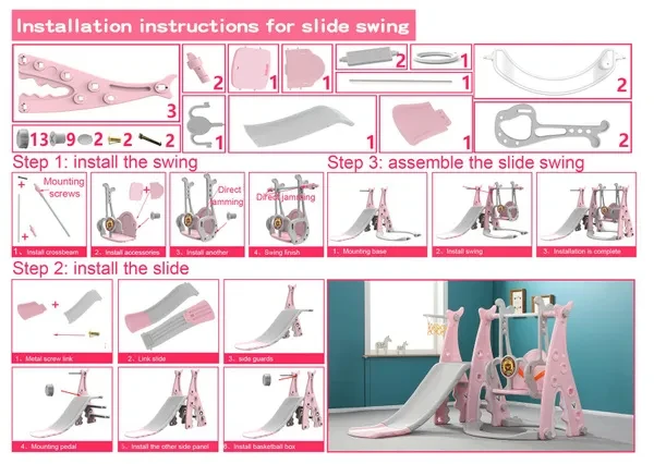 Hello, dear friend. Welcome to my store. ♥Packing list: 1x Slide Swing Combination ♥Specification: Toddler Climber and Swing Set Material: Plastic Packaging Size: 92x51x33cm/36.22x20x12.99in Package weight about: 11000g/24.25lbs Suitable for: 2-10 years old Color: Pink/blue ♥Feature: 3-in-1 Features: This bright and colorful 3-in-1 playing set offers 3 functions: a smooth slide, a sturdy swing, a basketball hoop and to the which is intended for family and domestic outdoor use. All activity elements are appropriately sized for toddlers. Sturdy and Durable: This bright and colorful 3-in-1 playing set is made of durable and non-toxc HDPE material, so it is safe for your kids to slide. This bright and colorful 3-in-1 playing set can accompany your child until he is growing up. Smooth Slide & Safe Swing: The children slide has the gentle slope and easy-to-climb steps offer your babies a smooth slide. The whole slide is connected smoothly without edges for babies tender skin. The children swing can maximum hold 66lbs with strong hangers, the ropes of the swing are made of high quality materials, it is long enough and safe, so it is safe to go swinging with your hand during playtime. Basketball Hoop & Lapping: The basketball hoop is designed according to European and American style, it is perfect for your little athlete to play basketball. When you don't want to use it, you can easily remove it, too. Easy to Assemble: This bright and colorful 3-in-1 playing set can be assembled quickly, it's easy to assemble the parts together with a few steps according to the instruction. All necessary hardware is included, no complicated tools needed. It will provide a never ending adventure for your little ones! They use it either inside or outside. Climbing ladder provides a safe and easy challenge for children. ➤Move to and click tag 【STORE Rating】 to buy more products you need in our store by touching 【Visit Store.Enjoy your shopping time and have a good day ~☺♥