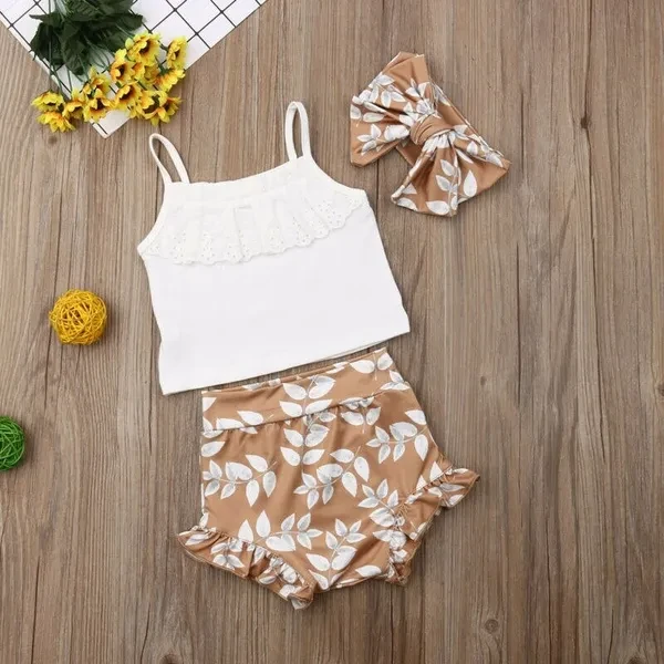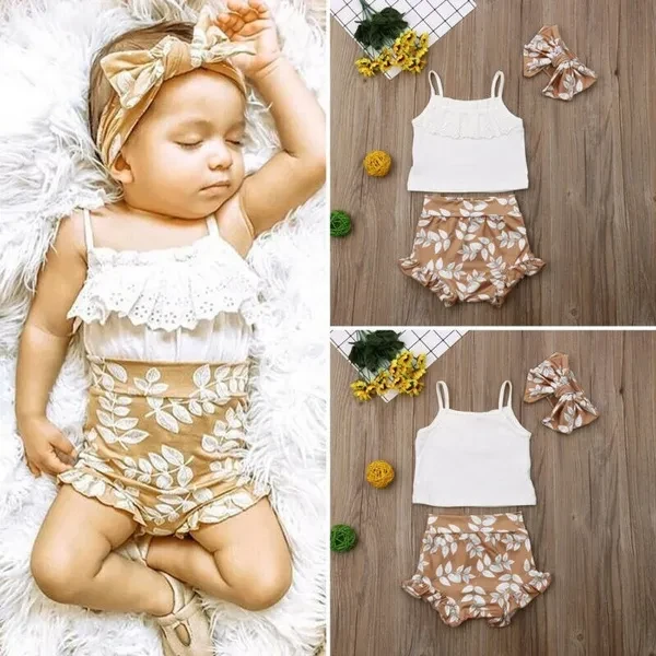 3PCS Toddler Baby Girl Summer Clothes Lace Sling Tops Floral Shorts Outfits 0-24M