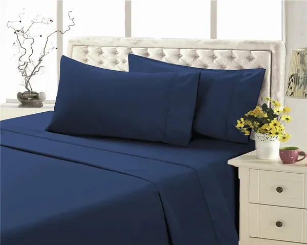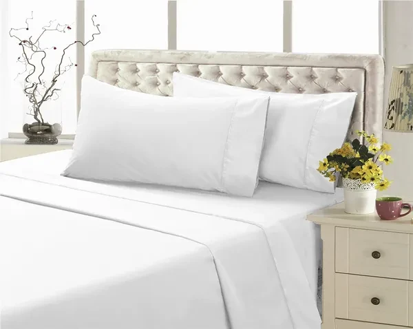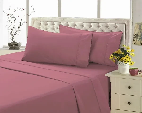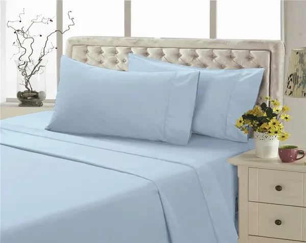 100% polyester microfiber Offers strength and exceptional softness Wrinkle resistant; solid color Fitted sheet has elastic to stretch and fit snugly over mattresses up to 15-inches deep Easy to care for: machine wash warm, no bleach, tumble dry low SIZE INFORMATION: Twin set: 1 Flat sheet 66"*96",1 Fitted sheet 39"*75"+12" Deep pocket,1 Pillowcase 20"*26"+4" Hem Full set:1 Flat sheet 81"*96", 1 Fitted sheet 54"*75"+15" Deep pocket, 2 Pillowcases:20"*30"+4"Hem Queen set:1 Flat sheet 92*102",1 Fitted sheet 60"*80"+15"Deep pocket,2 Pillowcases:20"*30"+4"Hem King set:1 Flat sheet 102"*106",1 Fitted sheet 54"*75"+15"Deep pocket,2 Pillowcases:20"*30"+4"Hem