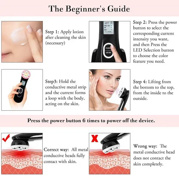 ??Face Massager Content: With box: 1*5 in 1 Face Massager(bulk pack ) 1*Base holder 1*USB cable 1*Use manual ??Face Massager Specification: Material: ABS Input: 100V-240V Output: DC5V500mA Battery capacity: 750mAh Power: Max 10W Charging time: 3.5 hours Use time: 10min/time Product size: 165*45*46mm Color:white,black,pink ??Face Massager Features: 1.It's interated with photon LED therapy,radio frequency(RF)/EMS and LCD display techology 2. It helps the skin to tighten, maintain elasticity, prevent allergies and other problems; 3. It can relieve muscle soreness, reduce skin fatigue, soothe skin tightness, reduce redness, swelling and pain of skin, and resist repeated growth of acne; 4. Stimulate the production of collagen, can help the skin quickly introduce a variety of skin care products, so that the skin doubles the absorption of nutrients. 5.It's a beauty care tool for beauty salon at home/office/trip ??Why buy our Face Massager ? 【5 in 1 Face Beauty Machine 】The LED light has 5 colors with 6 skin care functions that are suitable for various skin problems. Make your face more soft and get the tender skin. 【Solve Different Skin Problems】Focus on reducing wrinkles, skin lifting & tightening, anti-aging and promote the absorption of skin care products. No age and gender restrictions, no time and place restrictions 【Nutrition Lead-In】Use our skin care massager with your skin care product like mask, gel or cream, you will find the absorption effect is much better than the effect that use by hand. 【Portable & Exquisite】 Our portable face care massager is light , small and rechargeable. You can do your own skin care at home and do not need to spend money in beauty salon. 【USB Charging】Our face care massager can be used anytime, anywhere with an easy-to-use USB cable. Fast USB charging via PC,power bank or directly connecting to power source. ??Any inquiry to buy Face Massager ? If you have any dissatisfaction or doubt about our Face Massager , please contact us for the first time, and we will give you a satisfactory solution within 24 hours.