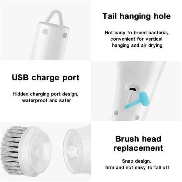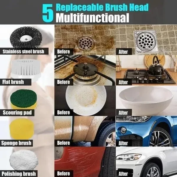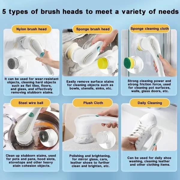 Item Name:Electric Spin Scrubber Battery TYPE :Li-ion Battery Batey Capacity: 500/800/1200 mAh Battery Quantity:1 Battery Voltage:4.2V Waterproof Grade:IPX6 Charging Current: 0.5-1A Charging Interface: USB Charging time:3-5 hour Working time:60-90min Rotating Speed:350 RPM Material:ABS Color: White Size: 28*15.5*10.5cm/11.02*6.1*4.13inch Package includes: 1X Host 1X Charging Cable 1X Nylon Brush Head 1X Plush Cloth Scouring Head 1X Steel Wire Ball Brush Head 1X Sponge Brush Head 1X Sponge clean cloth About this item 【Rechargeable & Powerful】 This electric cleaning spin scrubber is equipped with a 500/800/1200 mAh rechargeable battery, and built-in leakage protection technology to not only ensure charging safety but also make it keep working perfectly and continuously for up to 60-90min after fully charged for 3-5 hours. This Electric cleaning brush saves your tired body because of its 350r/min speed, allowing you to clean the stubborn stains more effectively. 【Portable & Cordless】 Getting rid of the long cord, you can easily use this cordless shower brush for cleaning any corner of the house, there will be no more plug and cable trouble. The ergonomic premium silicone grip can be held firmly even with sweaty or wet hands; Super lightweight, even children can easily use it. You will find house-cleaning will be so easy. 【Durable & safe】 This handheld power shower scrubber is made from premium ABS material, it is not only lightweight but also durable. Leakage protection and over-voltage protection ensure the safety of usage, even the children or elderly can use it with no worries anytime anywhere. Meanwhile, this cleaning tool is the best gift for your family and friends. 【5 Kinds of Replaceable Brush Heads】 The electric spin scrubber comes with 5 different kinds of brush heads which are made of premium coarse PC bristles that don't shed easily and prevent scratching up your house. You can use these different brush heads to clean bathroom bathtub, kitchen, grill, stove tops, heavily oiled wall, slot, sink, floor, grout, bathtub, toilet, car wheel, floor, tumblers, windows, dishes, and so on.