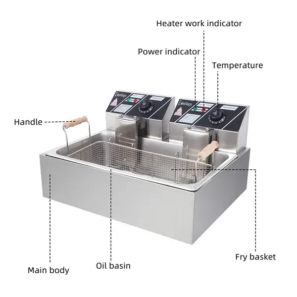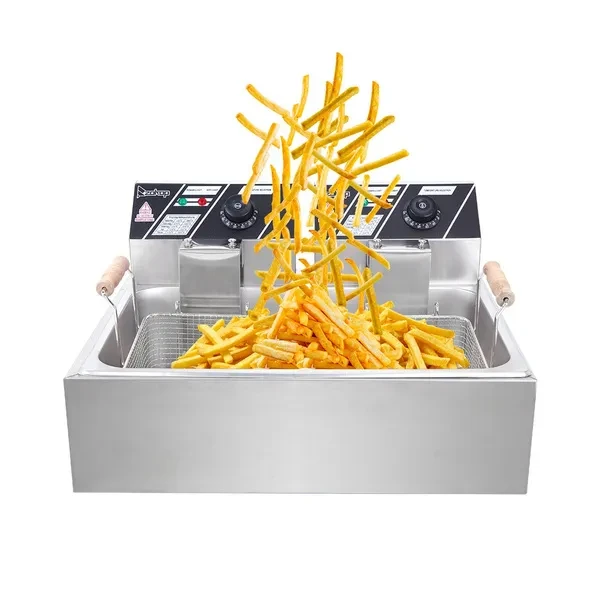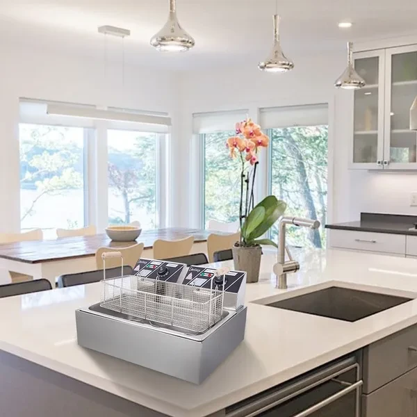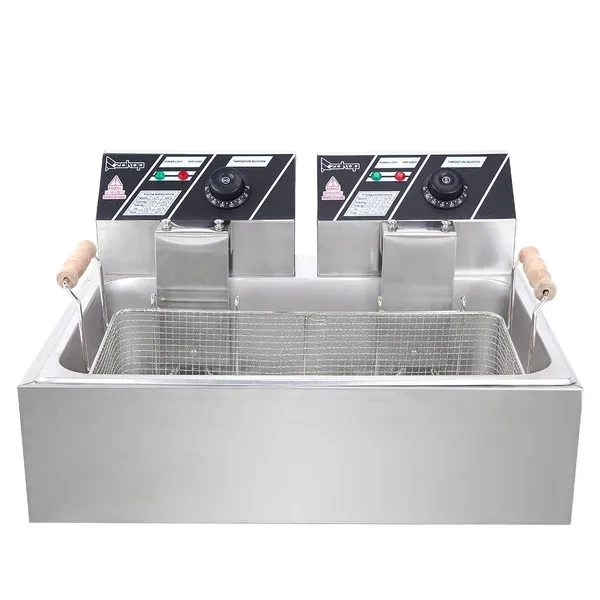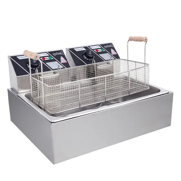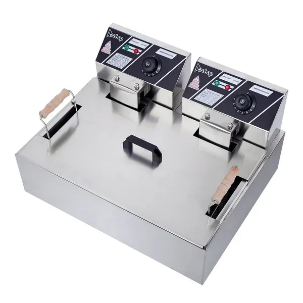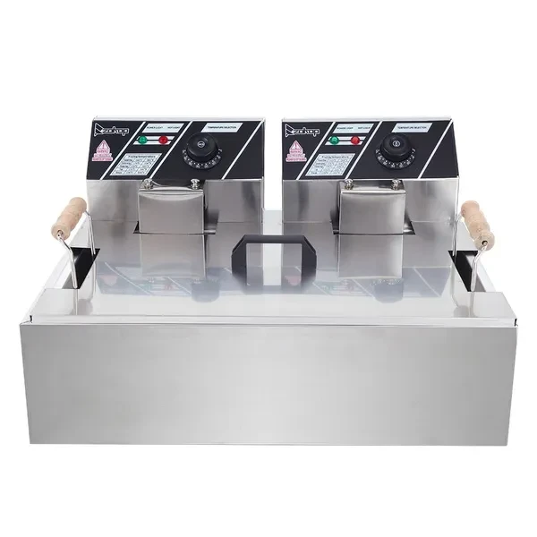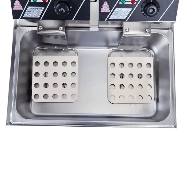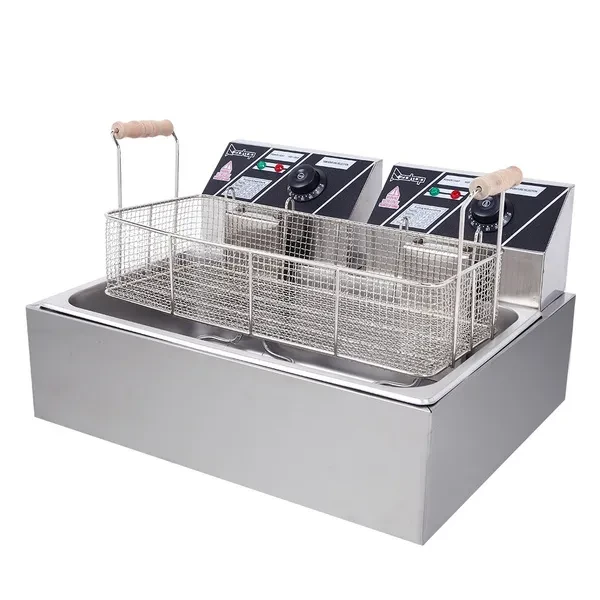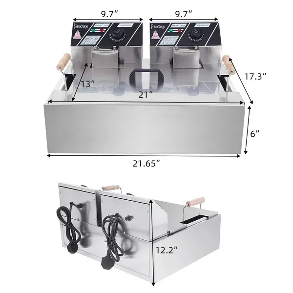 Introductions: This Stainless Steel Deep Fryer is durable for both home and commercial use. Easy to operate and clean. It is great for cooking French Fries, onion rings, egg rolls, fried chicken, shrimp and any other deep fried food. Dual electrical heads and power plugs for single large capacity tank application. In addition, it has a handle on both sides of the fryer basket to prevent scalding hands, safe and convenient operation. Would like to place an order now? Don't hesitate! Features: 1. Heavy duty stainless steel construction for commercial and home use 2. Dual electrical heads and power plugs for single large capacity tank application 3. Thermostats for accurate temperature setting 4. U-shaped stainless steel heating tubes for evenly heat distribution 5. Lid cover prevents the boil oil splashing 6. Fryer basket with handle on each side prevents scalding of your hands and brings safe and easy operation 7. Residue plate for filtering out the dregs 8. 2 hooks on basket for easy hanging up on bar 9. Tank can be detached for easy cleaning 10. 4 feet for good stability on countertop Specifications: 1. Max Power: 5000W (2500W For Each Head) 2. Recommended Capacity: 12.7Qt/12L Tank Capacity: 23.26Qt/22L 3. Voltage: 110V 4. Frequency: 60Hz 5. Temperature Range: 60℃ - 200℃ (140℉ - 392℉) 6. Overall Dimensions: (21.7 x 17.3 x 12.2)" / (55 x 44 x 31)cm(L x W x H) 7. Weight: 39.46lb / 7.9kg Package Includes: 2 x Electric Fryer Head 1 x Oil Pan 1 x Cover 1 x Fried Blue 2 x Slag Board 1 x Mounting Kit (4 Feet 1 x Lid Handle) 1 x Manual