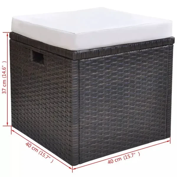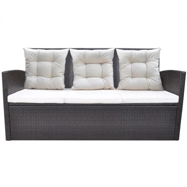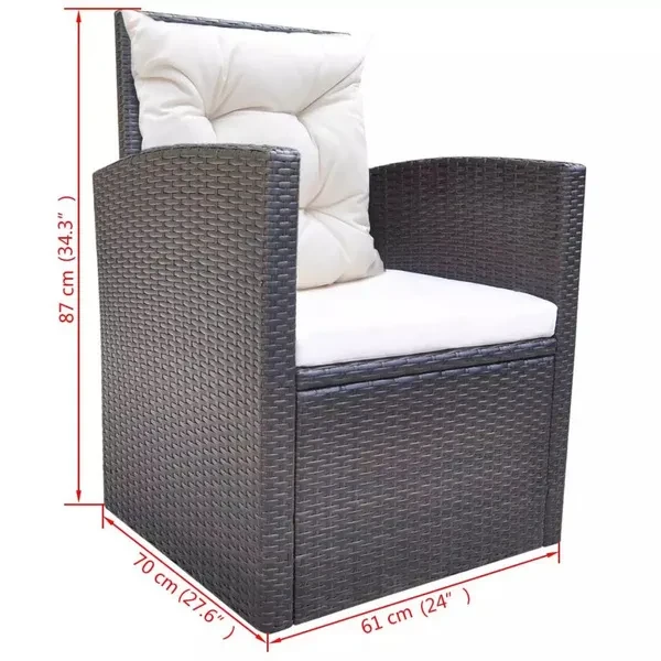 This stylish garden dining set made of rattan will be the focal point of your garden or terrace! This elegant seating group for 7 people is the best choice for all those unforgettable dinners outdoors and for relaxing weekend or evening hours in the garden. The powder-coated steel frame makes the table and chairs strong and robust, and thanks to their lightweight construction, all individual parts are easy to move. Thanks to the weatherproof and waterproof PE rattan, the dining set is easy to clean. The thick, soft cushions and pillows with vertical fiber cotton filling are very comfortable. The easy-to-clean polyester can be removed and washed using the concealed zip. The scope of delivery includes 1 table with glass top, 1 three-seater sofa, 2 armchairs, 2 footrests, 7 seat cushions and 5 back cushions. Note: We recommend covering the set when it rains, snow or frost. Rattan color: brown Pad color: cream white Material: powder-coated steel frame & PE rattan Upholstery cover: 100% polyester Pad thickness: 5 cm Three-seater sofa dimensions: 160 x 62 x 87 cm (W x D x H) Seat width: 142 cm Seat depth: 52 cm Seat height from the ground: 36 cm Height of the armrests (from the floor): 63 cm Armchair dimensions: 61 x 70 x 87 cm (W x D x H) Seat width: 52 cm Seat depth: 52 cm Seat height from the ground: 36 cm Height of the armrests (from the floor): 63 cm Footrest dimensions: 40 x 40 x 37 cm (W x D x H) Table dimensions: 120 x 70 x 66 cm (L x W x H) Delivery includes: 1 x table with frosted glass tabletop 1 x 3-seater sofa 2 x armchairs 2 x stools 7 x seat pads 5 x back cushions