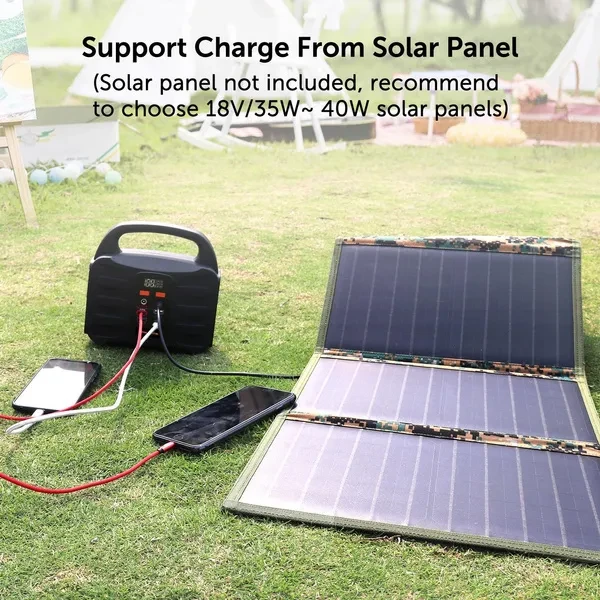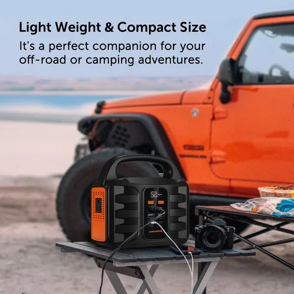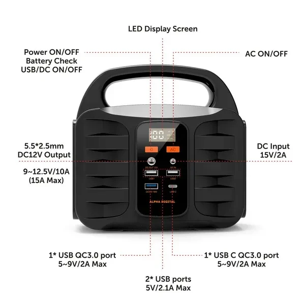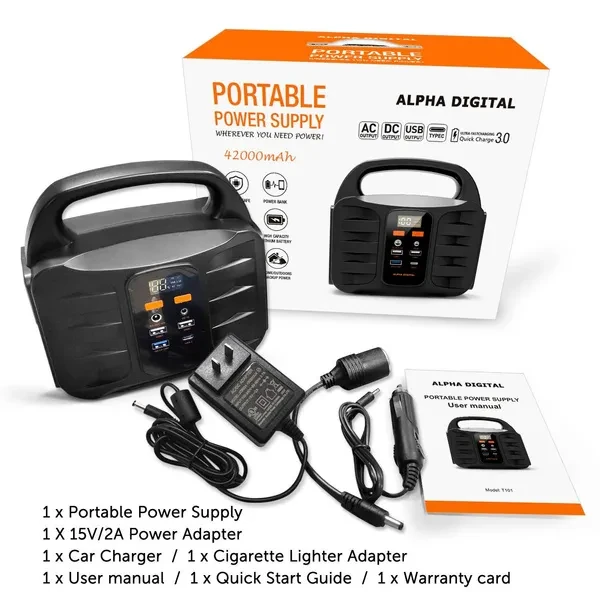 Features Points 1. On-the-go Generator: It offers 155Wh (42000mAh) of power capacity, provides power for laptops, camera batteries, TVs, fans, CPAP machines (working time depends on its output power) and other small appliances. Built-in LED Flashlight with SOS mode. Integrated Digital display for charge and discharge and battery life status. 2. Multi-Output and Rapid Charging: 4 USB charging ports (2* Quick Charge 3.0 USB port, 2* 2.1A USB ports) detect your devices to deliver its safest maximum charge speed up to 3A. Featured with 1 AC power outlets (110V/100W) for optimal versatility. Simultaneously power up to 6 devices. 3. Recharge in 3 ways easily: This power station can be recharged through an AC outlet using the included AC adapter, Charge from solar panel (Solar Panel not included), or Charge from your car with a 12V cigarette lighter. On the wall, you can recharge the power supply by AC outlet. When driving, recharging is super-easy by 12V cigarette lighter for 11 hours. And built-in MPPT helps it recharged under sun with solar panel. 4. Multi-Safety protections: Safety Protection including Over charge protection, Over Release Protection, Over Current Protection, Short Circuit Protection, Over Power Protection, Over Temperature Protection. 5. Portable & Compact: Super slim size (7.32 x 7.09 x 4.21 inches) and lightweight (3.42lbs). The portable power station with a compact handle design is not only for emergency backup power at home, but also for camping or wherever you need power when you are on the go. Product Description: Alpha Digital’s T101 is a portable high-capacity Power Station. The portable power generator supports solar charging function, allowing you to replenish energy at any time during outdoor camping and travel. The compact size can provide 155Wh/42000mAh of power. Convenient 3 ways of recharging (solar panel, wall charger, car charge) can get juice back easily. AC is suitable for small electrical appliances below 100w, and is a good partner for outdoor camping, and can also be used as an emergency backup power supply. ALPHA DIGITAL T101 Portable Power Station Input: ●Way 1: Charged by wall outlet (DC 15V/2A) ●Way 2: Charged by solar panel (DC 13~22V/2A Max) ●Way 3: Charged by car charger Output: ●1* DC Output: 9~12.5V/10A(15A Max) ●1* AC Output: 110~240V 50/60Hz ●2* USB Output: 5V/2.1A Max ●1* USB QC3.0 output: 5-9V/2A ●1* USB C QC3.0 output: 5~9V/2A On-the-go Generator It offers 155WH (42000mAh) of power capacity, provides power for mobile phone, tablet, laptops, light camera batteries, TVs, fans, CPAP machines and more at anytime. (working time depends on its output power) LCD display screen Multifunctional LCD display will show you the remaining energies/charge/discharge/AC output/DC output status. Ultra bright LCD screen let you know the statue of battery pack even no light source camping. Super Bright LED Light 4W Ultra bright LED light With Steady/Strobe/SOS mode, 3 LED modes for camping and emergency. Lighting at night and emergency work are perfect. Recharged by ac wall charger Plug it into the wall charger can be fully recharged about 7~8 hours. Recharged by cigarette lighter adapter Recharge from your 12V car charger about 11 hours. Recharged by solar panel Fully charged under the straight full sun around 11 hours when connected (recharging time varies from a different location, temperature, weather, etc.) (solar panels not included, recommend to choose 18V/35W~ 40W solar panels). Safety protection ●Over charge protection / Over Release Protection ●Over Current Protection / Short Circuit Protection ●Over Power Protection / Over Temperature Protection Specifications ●Capacity: 155Wh/42000mAh ●Dimensions(L*W*H): 186x107x180mm ●Weight: 1. 55Kg ●Built-in Battery: High Quality Lithium ion Batteries ●Input Recharging : Adapter: DC15V/2A ●Solar Panel Charging: DC 13V~22V/2A Max ●Fully Charged Time: DC15V/2A: 7~8 hours ●DC Output: 5.5 x 2.5MM DC Output: 9~12.5V/10A(15A Max) ●USB Output: 2 x USB 5V/2.1A Max ●1 x USB C 5-9V/2A QC3.0 ●1 x USB 5~9V/2A QC3.0 ●AC Output: 10/120/220/230/240V 50/60Hz ●AC Power: AC Continuous Output: 100W (150W Max) ●Bulb Type: 4W Ultra bright LED light With SOS/ Blink mode ●Power Indicator: Led Display ●Operation temperature: -10°C-40°C ●Lifecycle: >500 times What’s-In-The Box? ● 1 x Portable Power Supply ● 1 x 15V/2A Power Adapter ● 1 x Car Charger ● 1 x Cigarette Lighter Adapter ● 1 x User manual ● 1 x Quick Start Guide ● 1 x Warranty Card