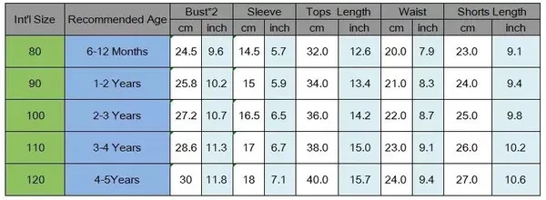 Fashion design,100% Brand New,high quality! Material: Cotton Color: Coffee,Blue Size Tops Length(cm) Bust(cm)*2 Shorts Length(cm) Sleeve(cm) Waist(cm) Age 80 32 24.5 23 14.5 20 6-12M 90 34 25.8 24 15 21 1-2Y 100 36 27.2 25 16.5 22 2-3Y 110 38 28.6 26 17 23 3-4Y 120 40 30 27 18 24 4-5Y There is 2-3% difference according to manual measurement. please check the measurement chart carefully before you buy the item. 1 inch = 2.54 cm Please note that slight color difference should be acceptable due to the light and screen. What You Get: 1 x Top+1x Shorts