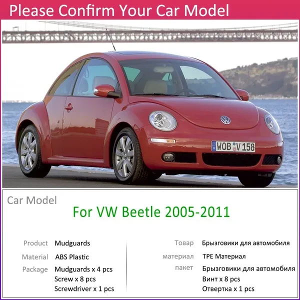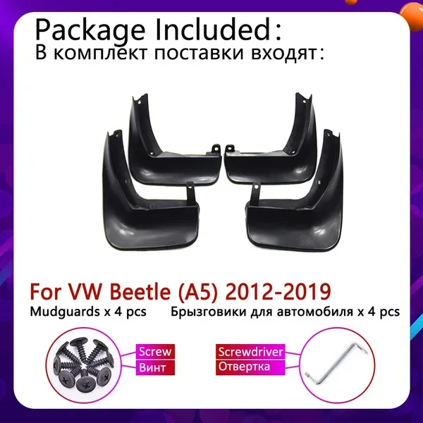 For VW Beetle 2005~2019 Deluxe Molded Splash Guards provide excellent lower body protection and accent the vehicle styling. Made of TPO Plastic to be rigid and paintable. They are molded to the contours of the vehicle for a custom fit These tough-wearing mud guards seamlessly blend with the vehicles styling and minimise the risk of dirt, road debris and stone chips flying up from the Front and rear tyres.Provide additional protection whilst enhancing the sporty exterior of your vehicle Installation instructions: 1,the car at the bottom of the original car screws with a wrench to screw down 2,take on the Mud flaps , good location, the screws installed 3,the screws installed in the corresponding hole on the Mud flaps. 4,the rest of the holes installed can be installed Package included: Mudguards*4 pcs Screw*8 pcs Screwdriver*1 pcs
