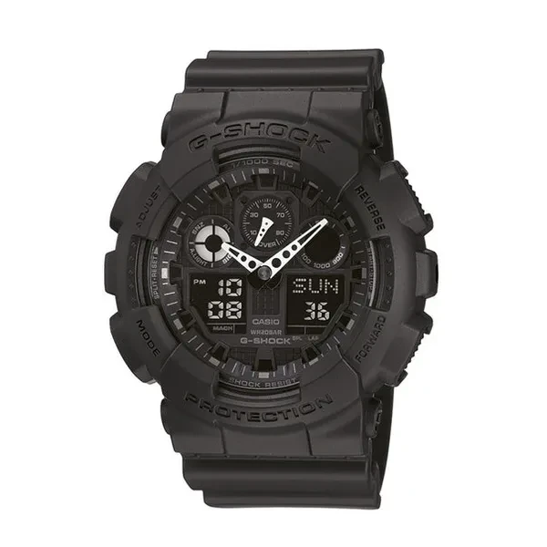 Black resin case with a black resin strap. Fixed bezel. Black dial with red and silver-tone hands and index hour markers. Minute markers around the outer rim. Dial Type: Analog-digital. Digital day of the week and date. Chronograph - three sub-dials displaying: 60 second, 60 minute and 1/10th of a second. Quartz movement. Scratch resistant mineral crystal. Solid case back. Case size: 51.2 mm. Case thickness: 16.9 mm. Round case shape. Tang clasp. Water resistant at 200 meters / 660 feet. Functions: day, date, 1/1000th second stopwatch, speed indicator. hourly time signal. auto-calendar. daily alarm. countdown timer. backlight auto led light with afterglow. 12/24-hour formats. world time 29 times zones (48 cities + utc)., hour, minute, second. Additional Info: 29 times zones, 4 daily alarms, an hourly alarm. Sport watch style. Item Variations: GA100 1A4, GA100.1A4, GA1001A4. Casio G-Shock Black Resin Strap Men's Watch GA100-1A4.