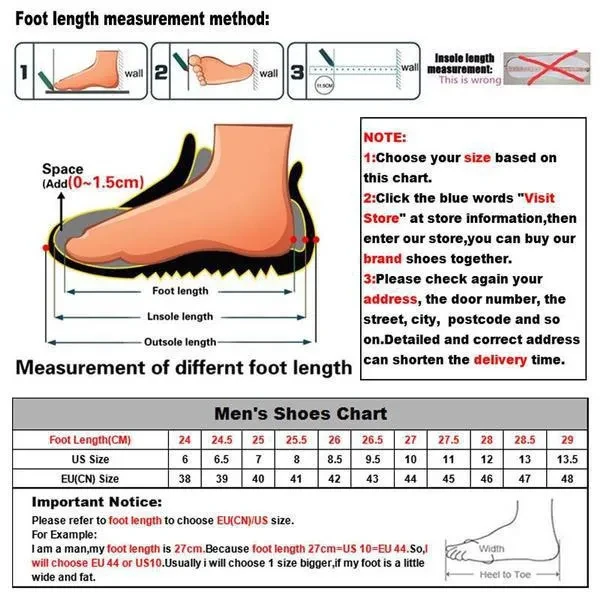 size: Please note. Simple packaging, in order to better protect the shoe CN/EU 39= US 6.5= Foot Length 245mm CN/EU 40= US 7.0= Foot Length 250mm CN/EU 41= US 8.0= Foot Length 255mm CN/EU 42= US 8.5= Foot Length 260mm CN/EU 43= US 9.5= Foot Length 265mm CN/EU 44= US 10 = Foot Length 270mm CN/EU 45= US 11 = Foot Length 275mm Size:39,40,41,42,43,44,45 Why buy from us?  Worldwide fast shipping! Free tracking number! Quickly and satisfying communication! Unique high-quality goods! Best prices! Please reference our size picture carefully! Measured by hands, please allow 1-3mm error! Due to computer monitor, may exist some color error, please do not mind!