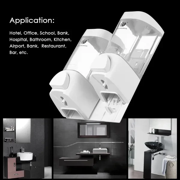 Features:Double Chamber: each inside chamber can be removed on it's own, not attached to the other ones.Transparent Bottle: to let you know when you need to fill it.Labels(English) Included: for you to label what inside is.Locking Design: equipped with a key, which is suitable for public places.Wall Mounted: works well in keeping the counter surface clutter free.Separated Bottle Design: more convenient and easier to pour the liquid soap inside.Separated Outlet Liquid Nozzle: no leakage and dispense soap precisely.Multifunctional: for holding liquid soaps, shower gel, shampoo, etc.Suitable for: home, office, school, bank, hotel, shopping mall, hospital, bar, etc.Specifications:Color: WhiteMaterial: ABSUsing Mode: PressInstallation: Wall-mountedCapacity: 300ml * 2Dispense Dosage: Approx. 1.8ml??Item Size: 132 * 79 * 170mm / 5.20 * 3.11 * 6.69in (L*W*H)Item Weight: 459g / 16.21ozPackage Weight: 524g / 18.50ozPackage Size: 18 * 14 * 9cm / 7.09 * 5.51 * 3.54inPackage List:1 * Liquid Soap Dispenser4 * Hose4 * Screw2 * Key1 * Label
