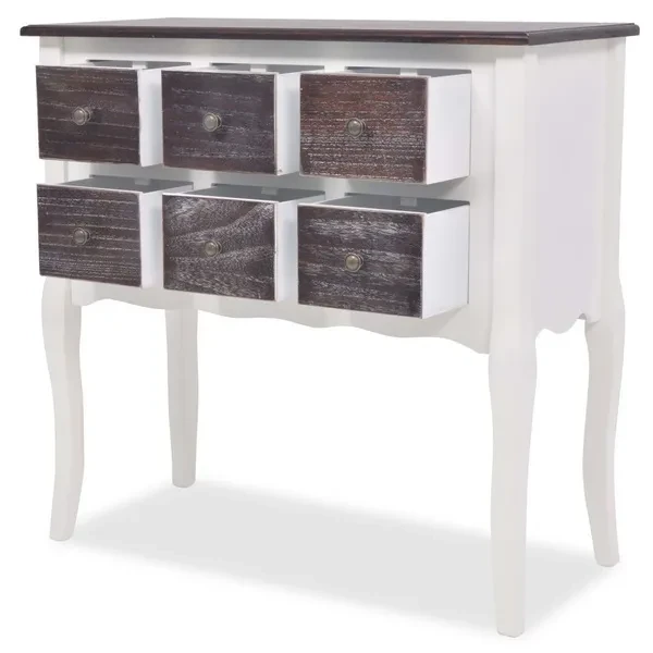 This beautiful console cabinet table will titivate your bedroom or living room! Crafted from the high-quality wood and polished to perfection, this fabulous cabinet not only stores your stuff but enhances your room decor as well. Easy to move and durable in construction, this valuable vintage artifact comes studded with a spacious storage space and ornamental drawer knobs. There are six drawers adjoined to the table top to hold your valuables. The drawers can be easily removed for cleaning. The sleek curved legs provide luster and classiness. Featuring a sleek simplicity with versatile functionality, it makes an appealing console table cabinet next to sofa, beside the bed as a handy nightstand, or an attractive catch-all cabinet for a home office or bath! Colour: Brown and white Material: MDF, brushed pine Dimensions: 80 x 36 x 79 cm (L x W x H) WARNING: In order to prevent overturning, this product must be used with the wall attachment device provided