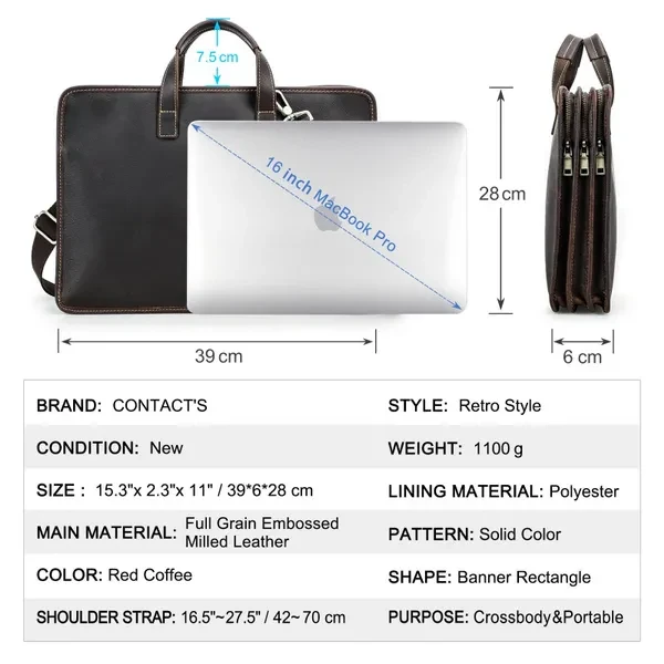 ● Genuine Leather Type: Cow Leather ● Place Of Origin" China (mainland) ● Size: 39*6*28cm ● Interior: Cell Phone Pocket,Interior Zipper Pocket,Interior Compartment,Computer Interlayer ● Handle/Strap Type: soft handle ● Material Composition: Genuine Leather ● Weight: 1.1kg ● Model Number: MB289 ● Lining Material: POLYESTER ● Style: vintage ● Gender: Men ● Pattern Type: Solid ● Closure Type: zipper ● Main Material ● Brand Name: Contact’S ● Item Type: Briefcases