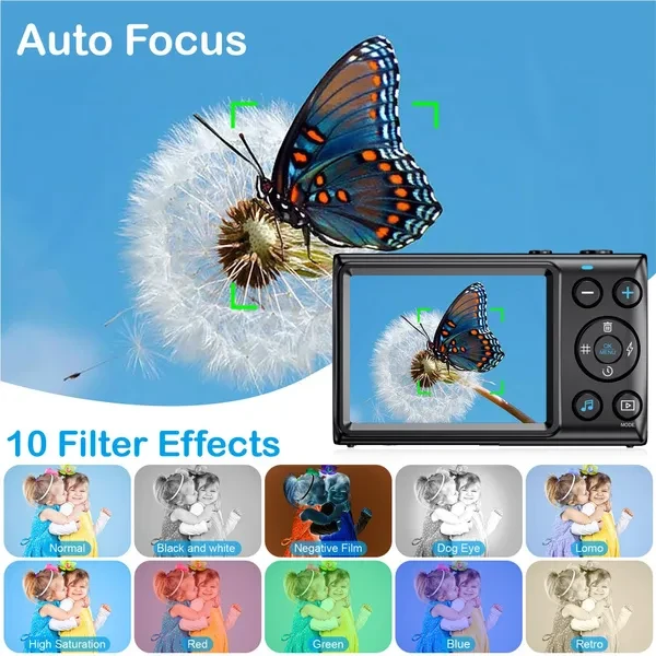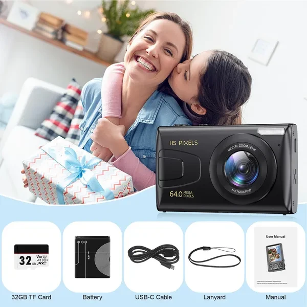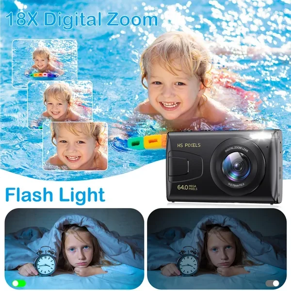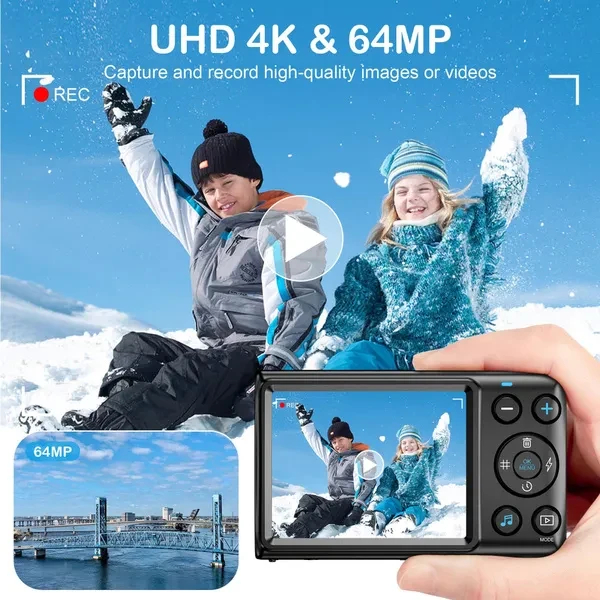 ?【Shoot Beauty with Easy】The kids digital camera captures high-clarity 4K videos and 64MP photos with a high-level CMOS sensor and Anti-Shake function.Let kids easily shoot the family warm picture. Simple to use, no need for complicated operation, only need to install the battery and ?SD card(NOT INCLUDED), switched it on within 2S. Tap the shutter, enjoy the fun of photography!