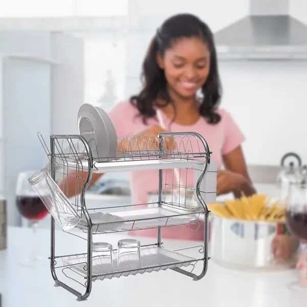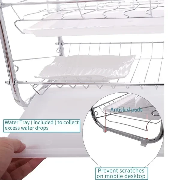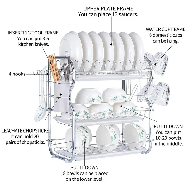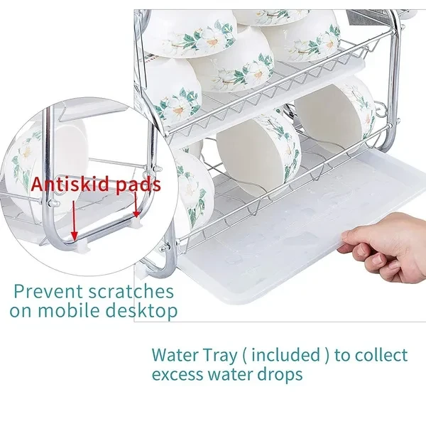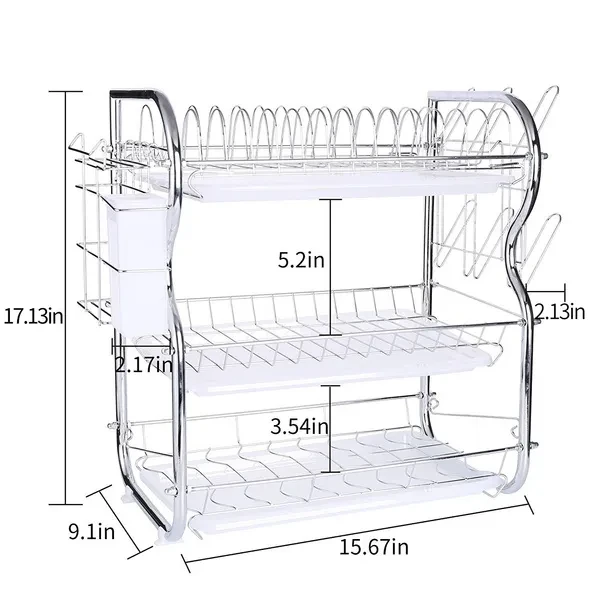 Our dish rack are designed in 3 layers and can hold more bowls and plates. The hooks on the side can hold 6 cups、multiple forks and chopsticks. Modern design 3 tier kitchen dish drying rack are made of new chrome-plated rust-proof material for stability and durability. Each floor has a drawer-type water tray. The water tray has a food grade PP material, which is environmentally friendly and flexible. The first layer height is 6 cm. It can be placed more firmly and placed on the plate for quick draining. Each floor has a water tray to collect dripping water and easy to remove. The bottom has a non-slip mat that can be placed firmly on the kitchen counter, each floor is made up of 8 screws and nuts, making the dish drying rack stronger Use our dish rack to better manage and store your kitchen counter, keeping your kitchen away from the messy, slippery, Generously sized and exquisite style that makes it suitable for more families. Get one that will last a lifetime and Will provide value to your family. The size of this dish rack is 16.5'' * 9.84'' * 17.7'' ,Top shelf height 2.4'',Intermediate interval 5.5'',Bottom spacing 6.3