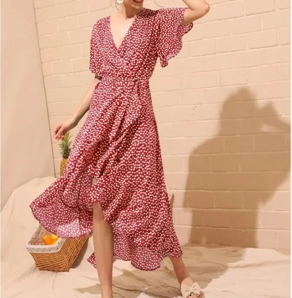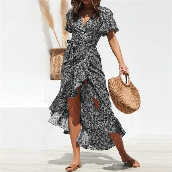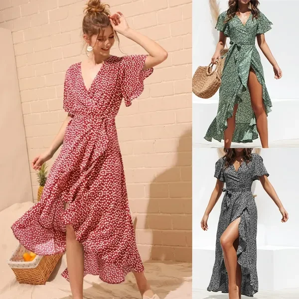 Fashion V Neck Short Sleeves Hem Ruffles Split Print Collect Waist Dress Holiday Beach Long Dress Casual Women Maxi Dress