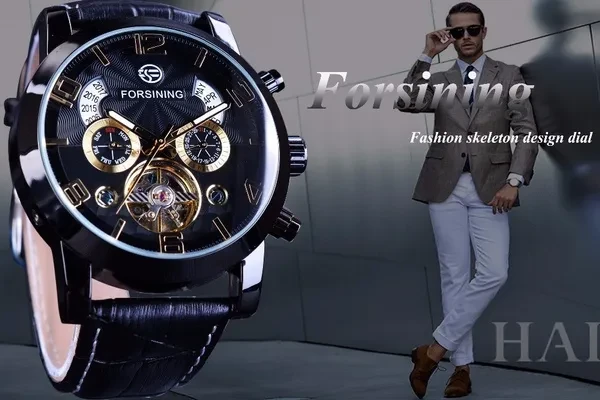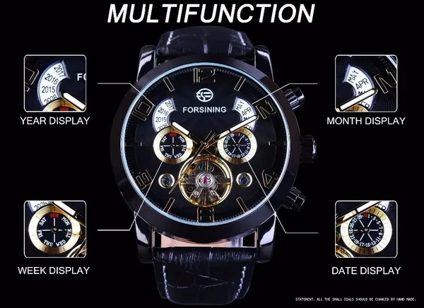 Description: -Genuine Leatherleather band gives you a new classic definition. - Tourbillon dial design reveals your fashionable point of view. - Stainless steel watch case makes the watch more durable. - Daily water resistance (not for showering and swimming). - Color may not appear as exactly as in real life due to variations between the computer monitors and nacked eye color difference. Specification (approx): - Diameter: 46mm - Thickness: 15mm - Length of watch band: 24.5cm - Band width: 24mm - Movement: Mechanical watches - Watch band: Genuine Leather - Watch case: Stainless steel Package includes: - 1 x Mechanical watch - 1* Forsining Cardboard Gift Box Reminder: 1. Please peel all films off before wearing. 2. Please keep the watch away from magnet to avoid making the watch stop working. 3. Please wind up the watch before every usage.