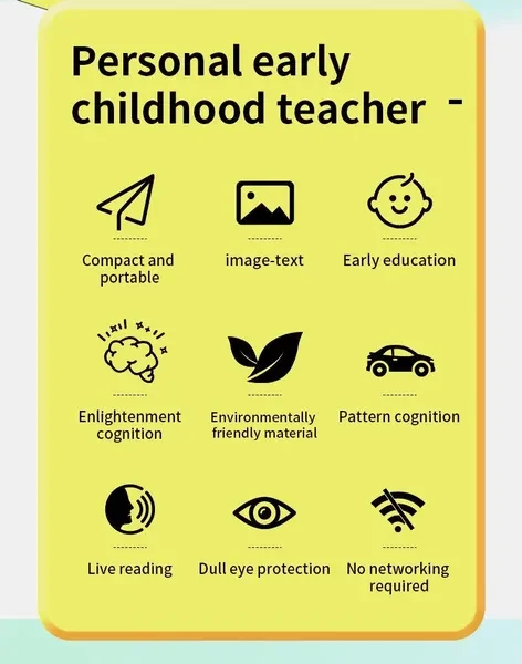Main function: Enlightenment early education, suitable for children under 6 years old, equipped with 112 cards, a total of 224 English words Battery: Built-in 300mah Connection: No need to connect, insert card to play Charging: USB charging Product size: 11.5*95*21mm The packaging boxes of the English and Spanish versions are different, and the product appearance is the same. The Spanish version has both Spanish and English pronunciations. Note: 1.Keep away from fire and water. 2.Due to the difference between different monitors, the picture may not reflect the actual color of the item.We guarantee the style is the same as shown in the pictures.