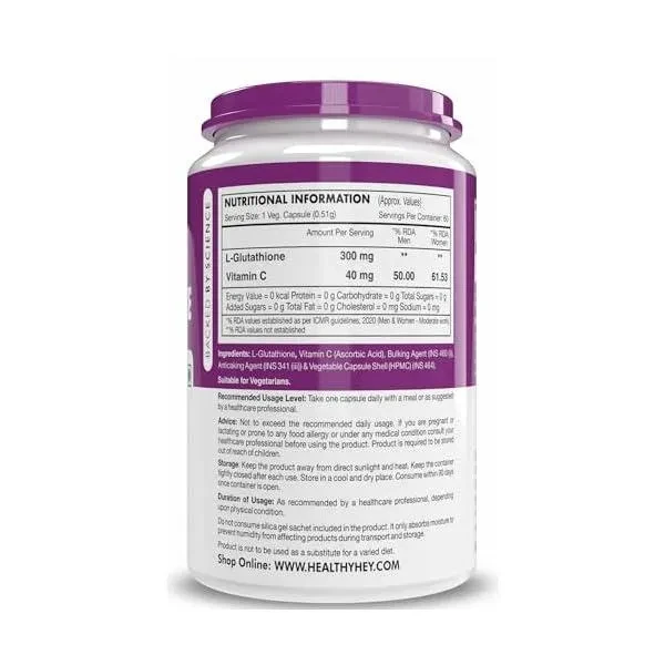 HealthyHey Nutrition Glutathione - Support Skin Health - 100% Vegetarian Source - 300mg - 60 Veg Capsules