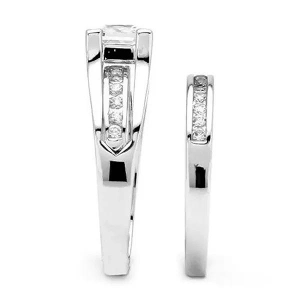 Women's ring This women's beautiful 2 piece AAA grade cubic zirconia wedding set is amazing. Engagement ring features a 1.25 ct (6mm) princess cut center stone alongside 21 round side stones. Matching wedding band has 15 round cut stones in a channel setting. Total carat weight is approx 2.10 diamond equivalent. Top quality stones display amazing enriched clarity just like real diamond! Made from solid sterling silver (stamped .925) with high quality rhodium plating for years of carefree wear and shine (platinum look). Men's Ring 6mm or 8mm 316L Stainless Steel Cubic Zirconia Inlay with Center Stone Classic Wedding Band Ring. Features a clear .06 ct (2.5mm) round cut center stone accented by six (2mm) round cut stones. Total carat weight is .24 diamond equivalent. Top quality stone looks just like real diamond! Interior of band is slightly rounded to provide a comfortable fit for daily wear. Made of solid stainless steel with mirror polished finish. High quality stainless steel provides years of carefree wear and will not tarnish or discolor. Men's and Women's sizes available. All rings are U.S.A size rings. Please look at photo of chart for the equivalent international sizes. IF YOU ARE NOT SURE OF YOUR SIZE. YOU CAN MEASURE YOUR RING SIZE AT WWW.FINDMYRINGSIZE.COM Ring Sizes USA Size 5 = about 16mm diameter USA Size 6 = about 16.5mm diameter USA Size 7 = about 17.5mm diameter USA Size 8 = about 18mm diameter USA Size 9 = about 19mm diameter USA Size 10 = about 20mm diameter USA Size 11 = about 20.5mm diameter USA Size 12 = about 21.5mm diameter USA size 13 = about 22.5mm diameter