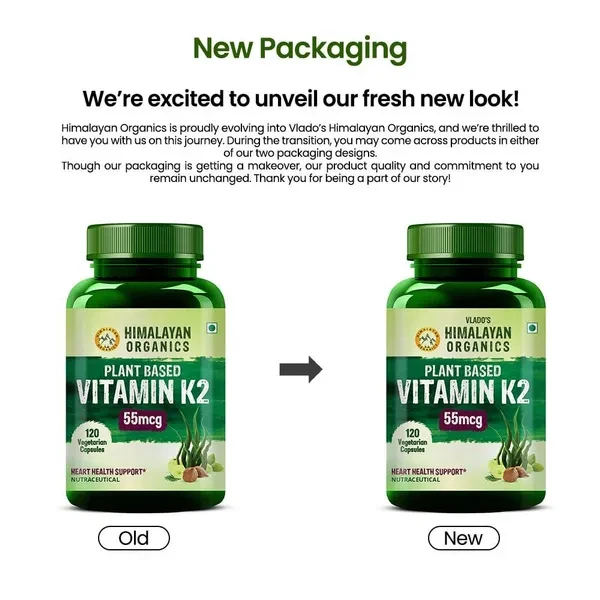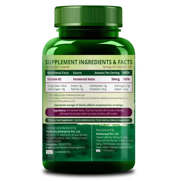 Plant-based formula - The capsules are curated with natural extracts like spirulina and are free from harsh chemicals. | Supports heart health - Vitamin K2 helps keep calcium away from arteries, promoting better heart functioning. | Helps strengthen bones - The supplement helps bind the calcium to the bones and encourages healthy bone mineral density. | Gluten-free, vegan-friendly supplement - The supplement is free from gluten, nut, soy, dairy, egg, fish, and shellfish, and is a vegan-friendly supplement. | 120 doses in 1 pack - The pack consists of 120 vegetarian capsules of plant-based vitamin K2.