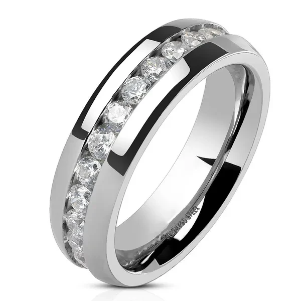 6mm or 8mm wide unisex AAA grade cubic zirconia comfort fit eternity wedding band. Made of solid surgical grade stainless steel with no plating and a high polished finish. This band showcases approximately 30 (2mm) round brilliant cut stones in a channel setting. The total approximate diamond equivalent weight is .90 carat. Our stones are made of the highest quality, is cut to perfection and display amazing clarity, just like real diamonds! Stainless steel 316 jewelry is very durable, will never oxidize and is hypo-allergenic.