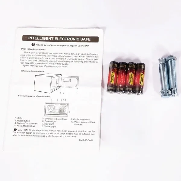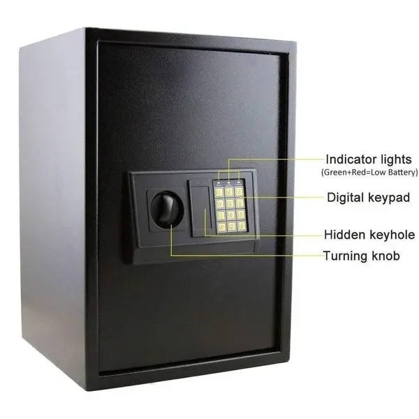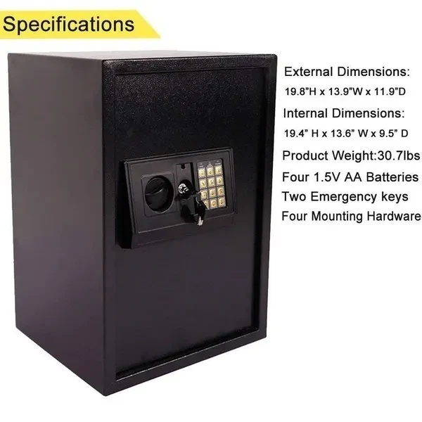 Features: 1. High quality and in a new condition 2. Sure to be the perfect addition to your home or office 3. Budget your money with this money bank 4. Support electronic password operation and password reset function 5. Compact size, room-saving and user-friendly 6. Widely seen among household or offices Note: 1.When receiving the goods, please confirm the product according to the listing of instructions. Once you find Less pieces, please provide relevant pictures to contact us. We will deal it in the time. 2.Please install goods with the instruction manual. 3.It is recommended that the installation should not be too tight to adjust easily. After the structure is installed, firm the interface for more stability. Specifications: 1. Model: E50EA 2. Weight: 490.66oz / 13910g 3. Dimensions: (13.85 x 11.89 x 19.76)" / (35.2 x 30.2 x 50.2)cm (L x W x H) 4. Material: Steel 5. Color: Black 6. Battery: 4 x 1.5V AA Batteries(Included) 7. Type: Storage Cabinet Package Includes: 1 x Strongbox 2 x Emergency Keys 1 x User Manual 4 x 1.5V AA Batteries