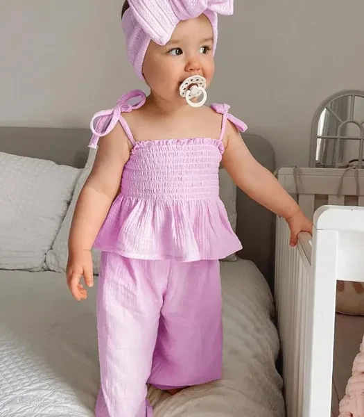COMFORTABLE MATERIAL---The two piece toddler girls outfit is made of 95% cotton 5% polyester, soft and breathable, does not irritate your baby's delicate skin, Linen cotton. your baby will feel comfortable and cool in summer. CASUAL DESIGN--- Solid color, baby girl camisole top with sleeveless, bandage straps and ruffle hem design. Baby pants are designed with elastic waist for easy fit, your little girl will love such a cute outfit! PERFECT GIFT--- Newborn summer clothes for girls is is the perfect summer clothing set for your girl, suitable for birthdays, Christmas, Children's Day as a gift for your toddler girl. MANY OCCASIONS--- Baby girl pants set is perfect for kids daily casual wear, indoor and outdoor wear, vacation, school, travel, beach, wedding, party, photo shoots, etc. VERSATILE DESIGN--- Little girl summer clothes can be perfectly matched can be easily matched with jackets, shoes, backpacks, sun hats, it is a perfect outfit for summer.