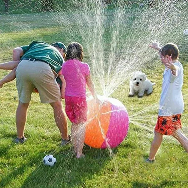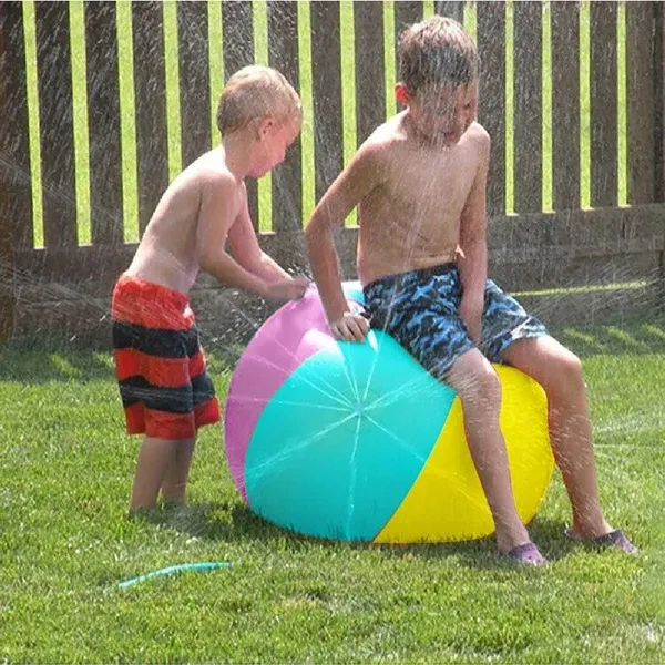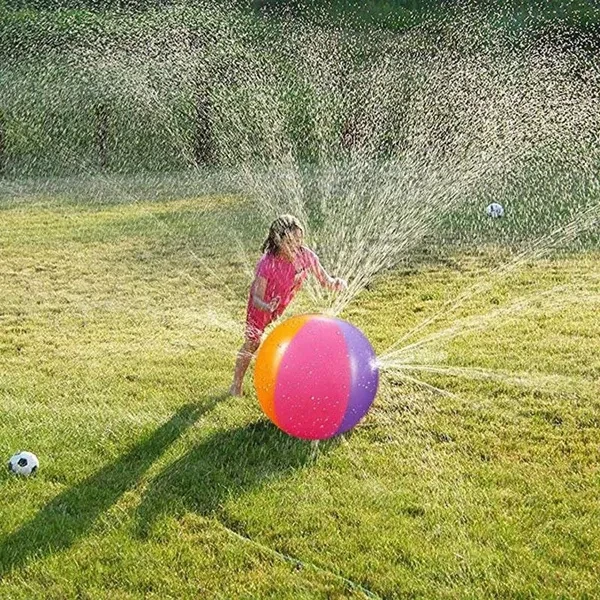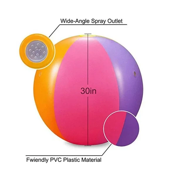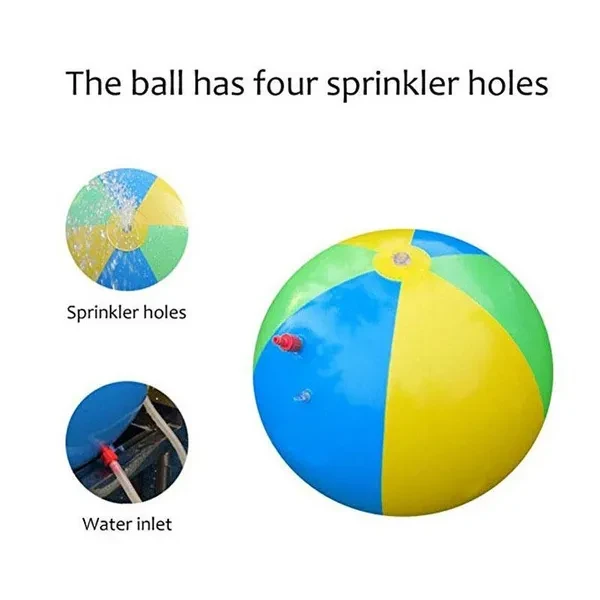 Feature: Inflatable Ball, easy to carry out, Easy to store. Summer Outdoor fun toy, water sprinkler for kids playing. Suitable for kids home garden, lawn, park or beach party. Portable large outdoor toy, high quality toy ball for children, funny outdoor game. Parameters(approx.): Name: Inflatable PVC water spray beach ball Material: high quality thickened PVC Size: 65CM / 25.6in after inflation Thickness: 0.18mm HOW TO USE: ★SET UP: 1. To inflate the ball, open the bottom air valve. Use an air pump (not included) to inflate and close the valve quickly so no air escapes. Make sure you do not over-inflate the ball. 2. The ball needs to have weight in the bottom so it doesn't roll around. Open the water reservior valve(beside the air pump nozzle) and fill the reservior. Close the valve securely so no water escapes. 3. Attach a garden hose to the ball by rotating the hose connector. Turn the hose on and change the water pressure if needed. ★DEFLATING AFTER USE: Your beach ball has a special air valve designed to inflate the ball quickly. Open the inner air valve. The air will leave the ball. When the ball is deflated, close the valve. Note: 1.This product is intended for use by children over 3 years. 2. For use with domestic water supplies (household hose lines) only. Do not use with other pressurized water sources. 3. Water left inside the garden hose or sprinkler for an extended period of time may become very hot. Allow water to run a short time before each use. 4. Drain product before storage. 5. This product is intended to be used as a toy and not as a personal flotation device. 6. Use only with adult supervision. Package Including: 1*Inflatable water spray beach ball