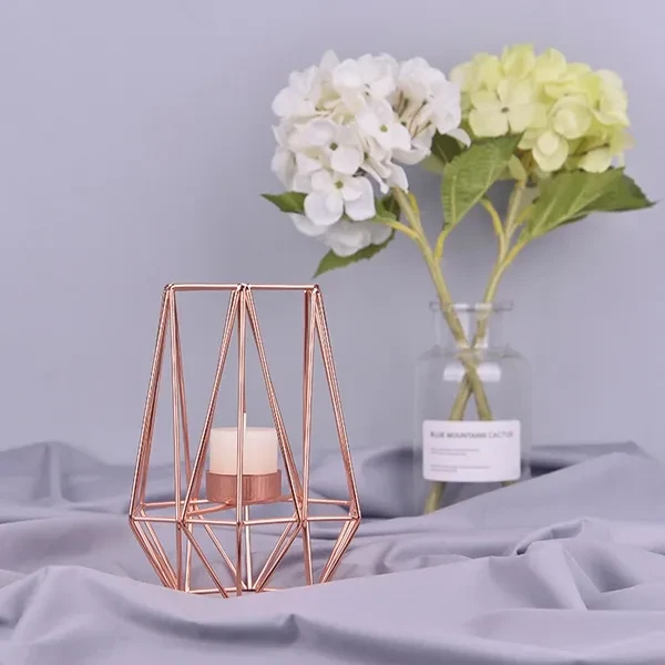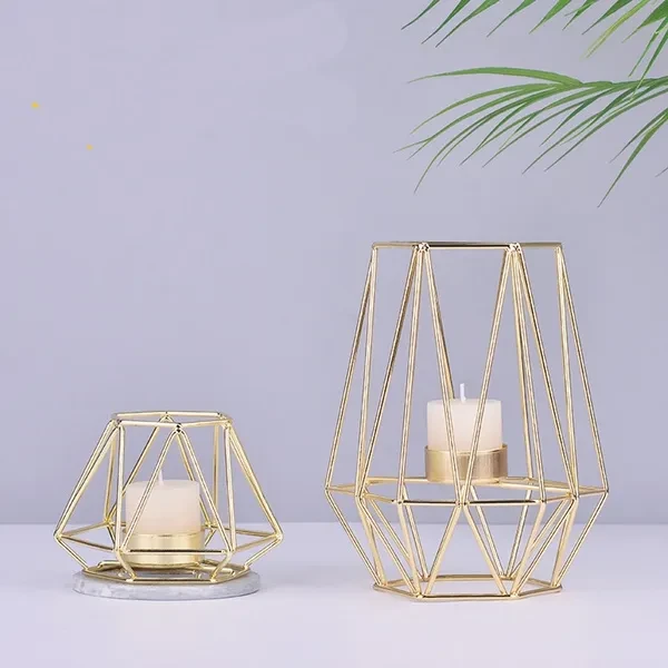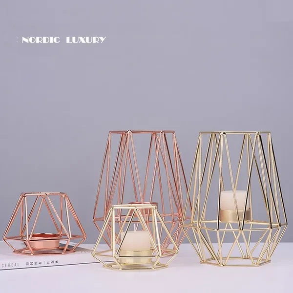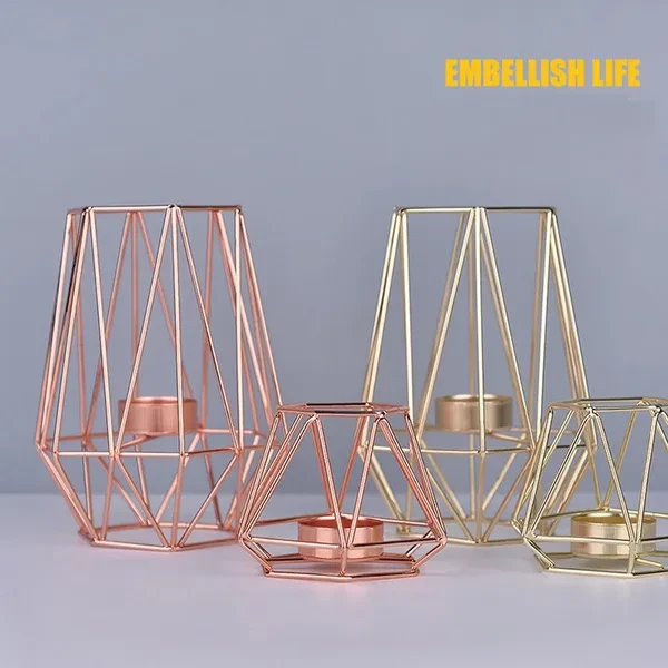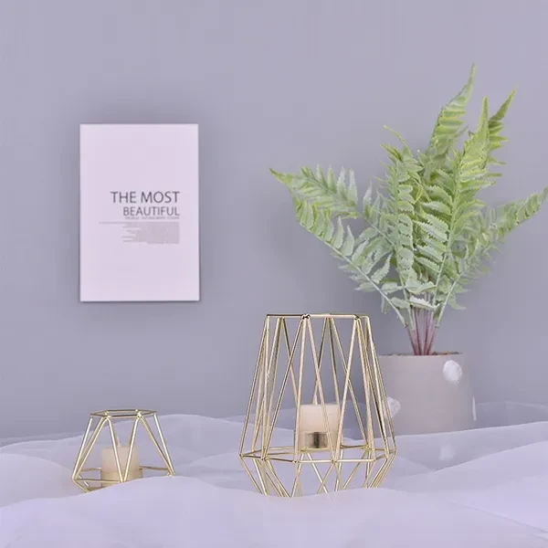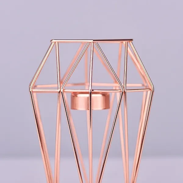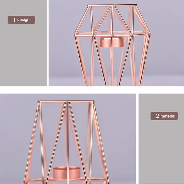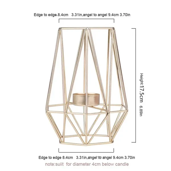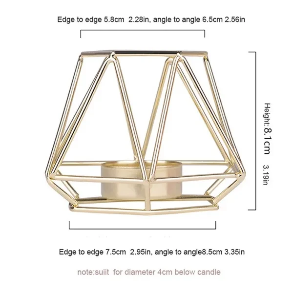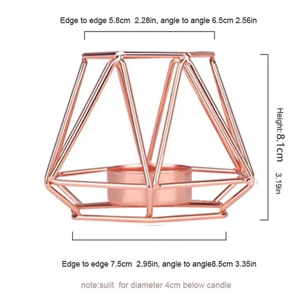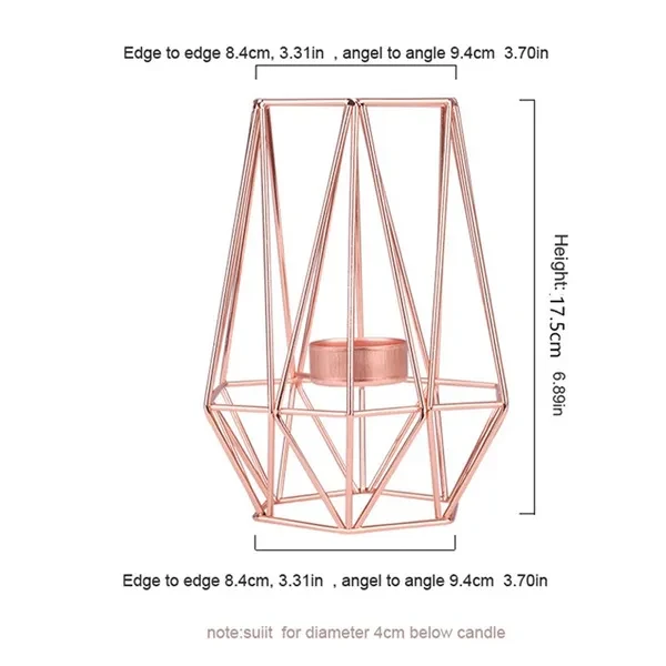 ✿Description: ➤Decorate your tabletop beautifully for party and special occasions,such as center of a coffee table,bedside table. ➤The warm glow given off by the votive flame within candle holder will provide a soothing,tranquil environment. ➤The geometric polygonal shape is special and makes your living environment more interesting and innovative. ➤Vintage Barn Style going on trends,will keep your decor in line with the latest interior design craze. ➤It's a good ornament for romantic wedding,bedroom,table decoration,a good gift for your friends and family. ➤The candle holders are a dramatic addition to any formal table setting, kitchen countertop or nightstand. ➤You can use it in your daily life,enjoy a romantic candlelight dinner or create a warm atmosphere in the shops and home. ✦Features: ✈Minimalist-style design makes life more beautiful ✈Lightweight and good quality ✈Crafted from metal with intricate cutouts ✈Create an enchanting display of light and shadow ✈Great design for placing around tables for a party ✈Easy to carry and durable in use ✈Easy care,Just clean them with cloth ✈Application:Living room,bedroom,study,hotel,festivities,parties and weddings ✈For Valentine's Day gifts,wedding decorations,home decoration,holiday gifts,Photo Props,holiday hotels ★Specification: ✔Material:Iron. ✔Color:Gold,Rose Gold. ✔Small:Height 8.1 cm. ✔Large:Height 17.5 cm. ✔ 1* Iron candleholder.(Candles are not included)