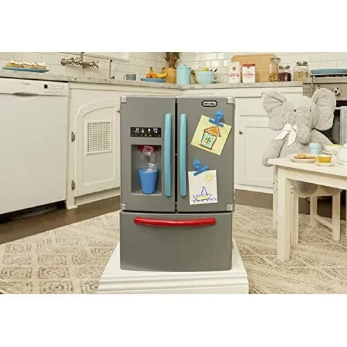 INTERACTIVE TOY: This toy refrigerator is designed so kids can pretend they're cooking and prepping meals as if they're using the real thing for hours of pretend play fun. SPECIAL FEATURES : The working ‘ice’ dispenser drops plastic ice cubes (included) and makes crushed ice and water dispensing sounds. The dual French doors feature an interior light that turns on and off when opened and closed. Separate pull out freezer beeps when it has been open too long. PRODUCT INCLUDES : 11 kitchen accessories: an ice cube tray, 4 ice cubes, 2 clips, an ice cream cone, a milk carton, a bottle of ketchup, and an orange. FREE TO DECORATE: Kids can decorate the fridge doors and make it their own using the clips to post grocery lists or display photos and art. GREAT FOR SMALL SPACES: Easy to set up to its full size (15.8” wide x 11.5” deep x 23” tall)