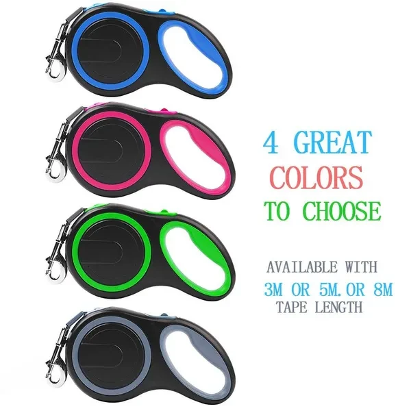 Material: Nylon; ABS+TPE material Color: green, blue, gray, pink Size: 3M; 5M; 8M (118.11inch; 196.85inch; 314.96inch) 3M is suitable for pets weighing up to 15 kg, with a belt length of 3m and a width of 1 cm 5M is suitable for pets weighing up to 20 kg, belt length 5m, width 1 cm 8M is suitable for pets weighing up to 50 kg, with a belt length of 8m and a width of 1.5 cm;(1 cm=0.39 inch,1 inch=2.54 cm) Package includes: 1x pet leash Function: Ⅰ Anti-skid brake and release button, with strength and durability. Ⅱ Provides three sizes (belt type), the traction rope can be up to 8 meters long, suitable for dogs under 50 kg. Ⅲ360°rotating anti-twisting lobster clamp with quick release device, anti-tangling and anti-twisting feeder. Ⅳ Lightweight and portable, the soft handle brings maximum comfort. notes: The power cord is only available in three sizes of colors: blue, gray, pink and green The size is manually measured, there may be an error of 0-0.5cm, which is a normal phenomenon. And due to the differences between different monitors, the picture may not reflect the actual color of the item.