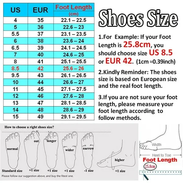 Welcome to our store! Wish all of you happy shopping! Package Including: 1 Pair of Shoes Note: Simple packaging without shoe box, in order to better protect the shoes. We will deliver the product to your hands as soon as possible. Season: Spring, Summer, Autumn, Winter Application: Casual, Sport, Outdoor, etc. Features: Breathable, Non-slip, Soft and Comfortable. Size Table: 1cm=0.39inch. Foot Length 22.1 - 22.5 cm = EUR 35 = US 4 Foot Length 22.6 - 23.0 cm = EUR 36 = US 5 Foot Length 23.1 - 23.5 cm = EUR 37 = US 5.5 Foot Length 23.6 - 24.0 cm = EUR 38 = US 6 Foot Length 24.1 - 24.5 cm = EUR 39 = US 6.5 Foot Length 24.6 - 25.0 cm = EUR 40 = US 7 Foot Length 25.1 - 25.5 cm = EUR 41 = US 8 Foot Length 25.6 - 26.0 cm = EUR 42 = US 8.5 Foot Length 26.1 - 26.5 cm = EUR 43 = US 9.5 Foot Length 26.6 - 27.0 cm = EUR 44 = US 10 Foot Length 27.1 - 27.5 cm = EUR 45 = US 11 Foot Length 27.6 - 28.0 cm = EUR 46 = US 12 Foot Length 28.1 - 28.5 cm = EUR 47 = US 13 Foot Length 28.6 - 29.0 cm = EUR 48 = US 14 Measured by hands, please allow 1-3mm error! Please choose the right size according to your real Foot Length!If your feet are a little fat, you can buy one size bigger. 1.You will find more amazing products if you visit our store. 2.We guarantee the lowest price and the highest quality for all of our products! 3.If you find a cheaper price than ours, it must be poor quality! Please be careful to buy! 4. Due to computer monitor, may exist some color error, please do not mind! 5.Because the size of the product is different, so the cost is also different, small size is cheaper than big size, please understand! Thank you! If you have any questions please contact us. Thanks for coming! Looking forward to come again!