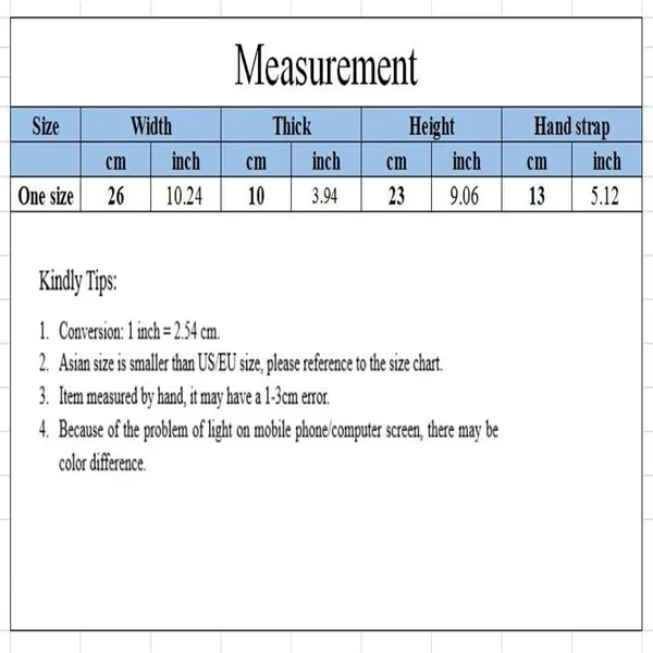 ❀☆ ❥Wish You a Happy Shopping❥ ☆❀ *Features* Color:White,wine red,Purple,black,Navy blue,grey,Pink Size:Width: 26cm, thickness: 10cm, height: 23cm, hand Strap: 13cm, error is about 3cm Material:PU Package Content:1 piece Kindly Tips: 1. Conversion: 1 Inch=2.54cm; 2. Due to lighting effects, display settings, etc., there will be slight color differences between website photos and actual items. 3. There may be a slight deviation in the size measured manually, please allow a difference of 1-2 cm. 4. The smell (fabric, plastic, glue, coloring, etc.) will dissipate after a few days in a ventilated place, which is not a quality problem. 5. If you cannot accept the above possible problems, please do not place an order.